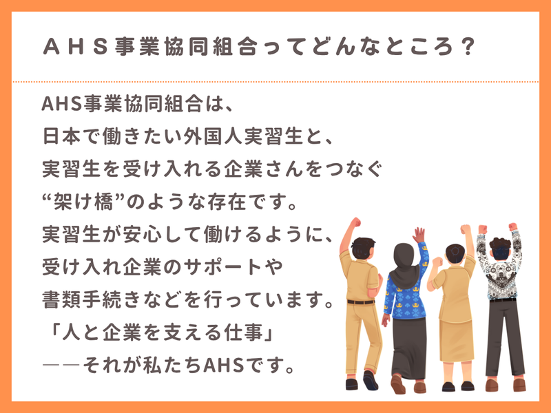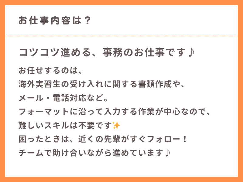 仕事内容 \働きやすさが自慢の当社の特徴/ ★残業ほぼなし(月平均10時間程度) ★土日休みが基本! ★5時間/日~OK! ★有給は半日単位で取得OK、消化率100% ★サポート体制◎ ★オフィスカジュアル・ネイルOK ★マイカー通勤可能、転勤なし ★定時退社多めで無理なく続けられる! ★組合なので安定して働ける◎ ******************** 海外実習生を受け入れる企業の お手伝いをお願いします✨ ******************** ■ここで働く魅力 ──────────────────── ✅残業少なめ …月の残業時間は約10時間 大体1日30分未満。 基本的に定時で退社で プライベート充実!✨ ✅基本的には土日休み+長期休暇あり! …土日休みがメインで、 年に3回の長期休暇あり◎ 長期休暇は7日~10日ほどあるので メリハリをつけて働くことができます✨ ✅有給消化率100%+半日から有給取得可 …「午後役所や銀行窓口へいきたい」 「平日に通院に行きたい…」 そんなときでも、 半日からサクッと有給取得OK♪ 1日使うまでもない予定も、 無駄なく調整できて安心です✨ しかも、有給消化率は驚異の100%! しっかり休める文化が根付いています♪ ✅事務経験を活かして即戦力に! …これまで培ったスキルを活かして、 スムーズに業務に取り組めます✨ 書類作成や電話・メール対応など、 経験がある方ならすぐに戦力として活躍可能です。 もちろん、社内ルールや 業務フローのサポートもあるので安心です♪ ✅チームで動いているのでサポート体制◎ お互い様、の意識で、 みんなでフォローしあってお仕事をしています✨ 早期退職などで、新しいお仕事を探されている方 そんな方にもピッタリの職場です! ✅オフィスカジュアルOK✨ …華美なものでなければ、 ネイルもOK♪ おしゃれも楽しむことができます( ^^) ♪ ✅マイカー通勤可能・転勤なし …無料駐車場完備でマイカー通勤もOK♪ 満員電車に揺られることなし! 転勤もないため、 地元で腰を据えて働きたい方にはピッタリ! ✅組合なので安定+安定して働ける◎ ■仕事内容 ──────────────────── 海外実習生を受け入れる企業の お手伝いをお願いします。 〈具体的には…〉 ・書類作成 ・メール・電話対応等 ・実習生の試験申し込みなど フォーマットに沿った簡単な書類作成なので 事務経験のあるかたなら大丈夫◎ まずは正確に書類をつくることから!✨ 書類は官公庁に提出するものもあり、 正しい情報を記載する必要があります。 はじめのうちは、 先輩社員と一緒に作業し、進めていきます。 お仕事の流れをご説明し、 少しずつ書類作成をしていきます。 分からないこと・気になることは すぐに質問できる環境ですのでご安心くださいね♪