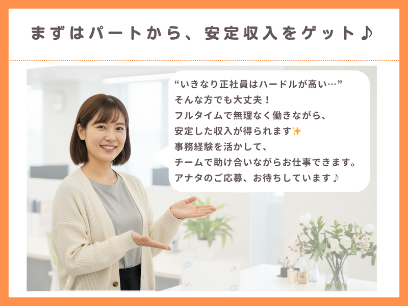 求めている人材 \経験者歓迎!スキルを活かして活躍できる方✨/ 学歴不問で、事務経験がある方を募集します。 社内のコミュニケーションはすべて日本語です。 <必須スキル> ・普通自動車免許(AT限定可) ・基本的なPC入力操作 ・日本語検定N1必須(日本語以外が母国語の方) <こんな方にピッタリ> ・家庭やプライベートと両立しながら働きたい方 ・正社員はちょっとハードルが高いけど、 フルタイムで安定した収入がほしい方 ・子育てやブランクがあって、 まずはパートから社会復帰したい方 ・コツコツ丁寧に仕事を進めるのが好きな方 ・チームで助け合いながら働きたい方 ・素直で前向きな気持ちで取り組める方 ・ハローワークでお仕事を探されている方