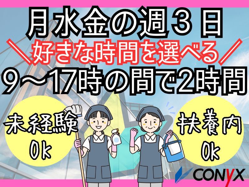 【勤務時間】 【勤務時間】 9:00~17:00の間で2.0時間 【勤務日】 月水金の週3日 ※希望に合わせて時間を変更して勤務可能です!