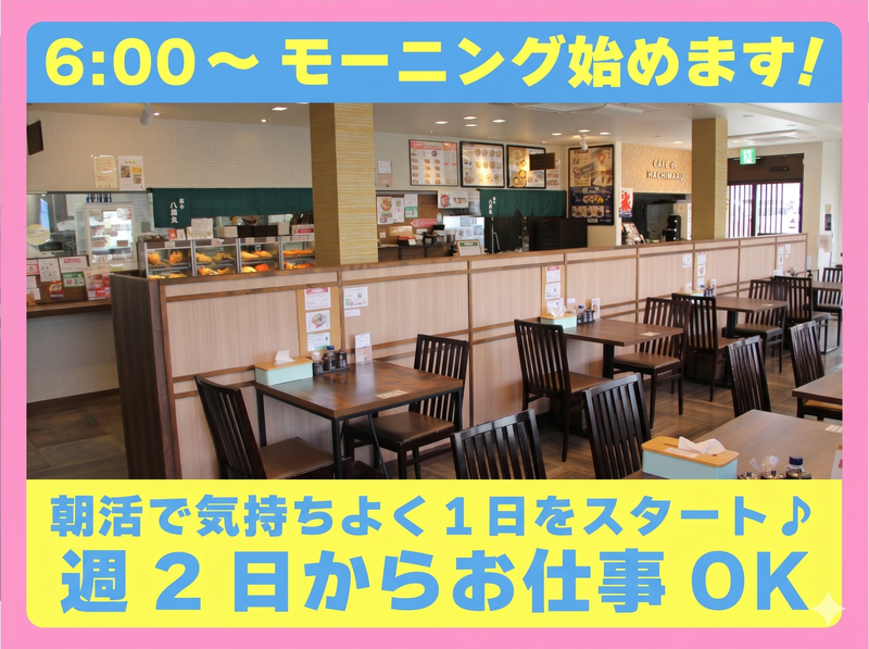 仕事内容 「安い、美味い、ちょっと速い!」 セミセルフ麺や【八刻丸】✨ 昨年から始めた『たこやき』も好評♪ その勢いのまま 『モーニング』と『大判焼き』も 始めちゃいます\(*'▽')/ / 『モーニング』の オープニングスタッフ大募集! 通常の麺とたこやき・大判焼きも スタッフ増員募集⭐ \ 接客、調理をお願いします。 仕込みや洗い場をお任せすることも。 和モダンでオシャレでキレイな店内♪ 明るい先輩たちがしっかり教えます! ハキハキ元気なスタッフが多いので 学生時代、部活を頑張ってきた方に ピッタリ♪ バイトデビューでも 久しぶりのパート復帰でも 馴染みやすい環境です⭐ みんな活き活きと働いてます♪ 難しい接客なし! 未経験も安心!! 麺はもちろんカツ丼などの温かい 丼物も人気! メディアや動画サイトの取材もくる 注目のお店です♪ ―――――――――――――――― ⭐『モーニング』⭐ ―――――――――――――――― 6:00~11:00 の固定勤務。 モーニング専属OK! 「昼まで勤務したい」も大歓迎! 朝活で健康的に働きたい方に オススメ♪ 週2日~無理なく始められます◎ ―――――――――――――――― ⭐『たこやき』『大判焼き』など⭐ ―――――――――――――――― テイクアウトコーナーは 駐車場側に昨年末に新設したばかり。 店内で繋がっているので たこやきはもちろん、カフェメニューや 八刻丸のテイクアウトメニュー・揚げ物 なども対応◎ 今回、大判焼きも始めます♪ 土日はより多くのお客様が来店して くださるので、土日のたこやき・ 大判焼き専任も大歓迎! ―――――――――――――――― ⭐『八刻丸』⭐ ―――――――――――――――― 9:00~21:00 スタッフ募集♪ 麺はもちろん1番人気のカツ丼や 揚げ物などの調理、接客をお任せ。 セミセルフなのでカウンター内が メイン。 おかげさまで忙しいですが 元気&明るいスタッフばかりなので 勤務も頑張れちゃいますよ★ 土日祝と毎月8日は 時給+100円~200円! ―――――――――――――――― ⭐<生き方自由!>の社風⭐ ―――――――――――――――― 髪色・髪型・ピアス自由♪ シンプルなネイルOK! オシャレしたままお仕事できる! のびのび自分らしく働きたい方、必見☆彡