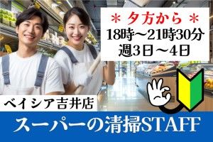 インフォメーション 《18時~21時30分・週3日~4日》清掃初めてさんも大歓迎!自動洗浄機でピカピカに。研修があるから安心スタート ~ 大型スーパー・ショッピングモールでのお仕事です ~ 《 ベイシア吉井店》 気持ちよくお買い物や施設を利用して頂けるよう ショッピングモール内をきれいにするお仕事です♪ 学歴不問・資格不問・経験不問・無資格OK 安定の長期歓迎/夕方からの仕事 午後のみ時短勤務(1日4時間以内OK)のパート・アルバイト 残業なし・少なめ+短時間勤務OK+扶養内勤務OK! ワークライフバランスばっちり◎ プライベートタイムも充実できます♪ 未経験者歓迎♪ 中高年・ミドルシニア・アクティブシニア活躍中です アピールポイント ◎夕方からの短時間 ◎日数少なめ 週3~4日 ◎扶養内で働ける! ミドル・シニア・主婦主夫活躍中! 未経験の方も丁寧に指導しますので 安心してご応募下さい♪ \ ご応募お待ちしております /