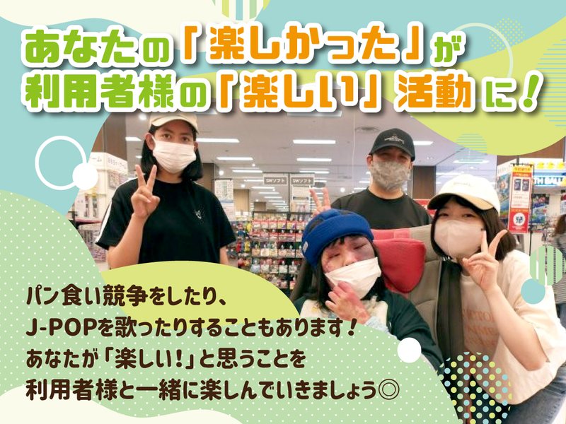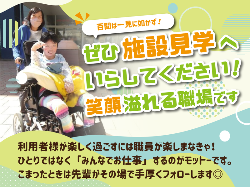 求めている人材 学歴不問・福祉系の資格不問・経験不問 ※必須:普通自動車免許 未経験者歓迎!障がいに関する知識や 福祉系のお仕事の経験がなくてもOK! あなたのチャレンジと成長を応援します。 *第二新卒歓迎 *ブランクOK \こんな方を歓迎します/ 〇新しいことに挑戦してみたい 〇人とお話しするのが好き 〇福祉への興味や運転免許を活かしたい 〇せっかくなら明るい職場で明るく働きたい 〇チームワークを大切にしたい ★未経験から始めたスタッフも多数活躍中! 「介護って難しそう…」という方でも大丈夫。先輩が丁寧にサポートします。 ★20~40代を中心に幅広い世代が活躍中! 子育て世代や家庭と両立している方も多く 長く続けやすい環境です。 **(20代女性スタッフの声)** ご利用者様は、好きも嫌いもはっきり 伝えてくれるとっても素直な方たち。 だからこそ、私も嘘偽りなく まっすぐの心で向き合っています。 …実は私、こどものころ保育士に あこがれていたんです。 「お世話する」という意味では ひとつの夢が叶ったと感じています。 >> 障がいに関する知識や経験がなくてもOK! 気になったらぜひ見学へお越しください。