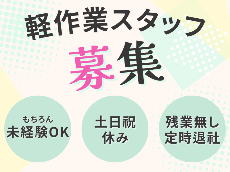 PR・職場情報 ★藤沢市×残業無しのお仕事! ★無料の構内駐車場・駐輪場あり!通勤ラクラク♪ ★最寄りバス停からも近くて便利♪ ★定期的に社内イベントも開催中◎(強制参加ではありません!) 求人の特徴 \ 来社不要の電話面接 / ▽平日の日中~夜、土日祝でも面接枠をご用意! ▽働いている方でもご自身の予定に合わせて面談予約ができます! ▽まずは登録だけでもOK!あなたに合ったお仕事をご紹介します! \ 応募前の相談もOK! / 疑問や不安のある方、お気軽にご相談ください◎ 公式LINE:https://lin.ee/xcwbDnZ <<応募から就業までの流れ>> 応募から就業まで平均1~2週間!応募後すぐ働けます♪ STEP1 WEBにてご応募 *応募後に届く面接予約のご案内メールより面談予約をお願いします ※既にご登録いただいている方は書類選考のご案内メールをお送りします ↓ STEP2 面接担当とお電話で面接 *お仕事の詳細説明や簡単なヒアリングを行います ↓ STEP3 職場見学 *実際に働く職場を見学できます ↓ STEP4 入社手続き *契約内容の確認や安全教育等を行います ↓ 就業スタート! *入社初日は営業担当も同行します 求人ポイント 残業なし,交通費支給,急募,主婦・主夫歓迎,長期,バイク通勤OK,学歴不問,車通勤OK,残業月20時間以内,転勤なし,未経験者歓迎,経験者歓迎,リモート面接OK,社会保険完備,制服貸与,禁煙・分煙,長期休暇あり,40代以上応募可,履歴書不要,固定時間制