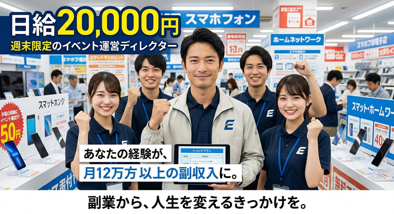 仕事内容: あなたのイベント運営経験を活かし、週末の副業で効率よく高収入を得ませんか? 現場の司令塔としてスタッフをまとめ、成果を最大化するやりがいのあるお仕事です。あなたの気配りや責任感がダイレクトに評価され、日給2万円という高待遇に繋がります 。 家電量販店でのスマホ・光回線PRイベントにて、人員配置やスタッフへの指示出し、クライアントとの打ち合わせを行います。集客や商談のフォローにも入り、現場全体を盛り上げてください。 <1日の流れ> 09:30 会場集合、売り場環境の設営 09:45 朝礼、各スタッフへ本日のミッションを指示 10:00 イベント開始。現場巡回と商談フォロー 13:00 休憩(しっかり1時間リフレッシュ) 14:00 午後の稼働。集客サポートを強化 18:00 片付け、退店。LINE実績報告で終了 今の仕事の負担にならず、あなたの手腕で現場を回し、頼られる喜びと確かな報酬を手に入れられます。 【主な業務内容】 •家電量販店内の携帯電話の販売促進イベントの会場の運営管理。 スマートフォンや光回線をはじめとした サービスをお客様に対し、サービスのご案内/ご提案/おすすめ ・イベント会場付近での集客補助 • クライアントへの実籍報告 結婚や将来のために選んだ今の環境を守りつつ、週末だけで「かつての自分」を超えていく。そんな攻めの副業を始めませんか? ※本求人はスマートフォン・インターネット回線の販売促進イベントのディレクター経験がある方向けの求人となります。該当しない方は弊社のセールススタッフ求人、もしくはアプローチスタッフ求人にご応募ください。