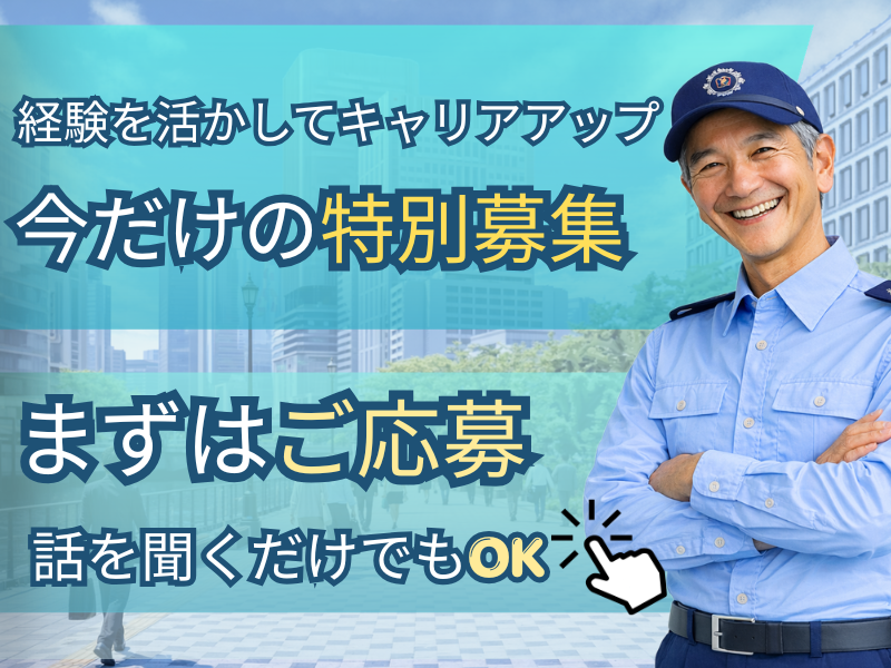 求める人材: <警察OBも大歓迎> ✨50~70代までの幅広い仲間が活躍中✨ 【交通誘導】【駐車場警備】【学校警備】 【工場警備】【病院警備】【道路警備】 【オフィスビル警備】【イベント警備】 【鉄道警備】【立哨警備】【モニター監視】 【ホテル警備】【交通管制】【設備管理】 など、さまざまな経験が活かせます。 もちろんなくてもOK! 正社員・契約社員・アルバイト・パート 派遣社員・業務委託契約など 前職の雇用形態などは一切問いません ※ハローワークで求職活動中の方もぜひ <下記の資格をお持ちの方歓迎×採用優遇> ★警備員指導教育責任者2号 ★1~4号の警備員指導教育責任者 ※18歳以上の方 (警備業法による)