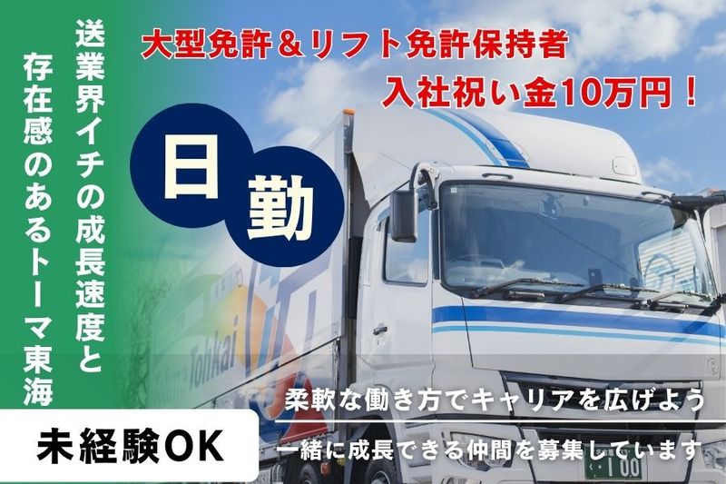 【仕事内容】 \日勤勤務のみ!大型ドライバー募集/ ✨業界屈指の成長企業【トーマ東海】で新しいキャリアを! 関西・関東エリアへ拠点拡大予定の、勢いある安定企業です。 普通免許があれば未経験の方もOK!免許取得支援制度で、中型・大型・リフト免許の取得もしっかりサポートします。 \ここで働くおすすめポイント/ ■月給33万円以上!経験を高く評価いたします! ■充実の手当&サポートで未経験から安心スタート ■免許取得支援制度あり ⏩️入社後の仕事の流れ 業務フローを先輩スタッフがレクチャーいたします。 その後必要な免許を取得後、実務をしていただきます。 ================== ✅従業員思いの福利厚生で安心スタート! ================== ⭐ 入社祝い金あり 大型免許&リフト免許保持者に10万円(規定あり) ⭐ 夏場はスポーツ飲料支給 凍らせた2Lを毎日支給! ⭐ 資格取得支援制度あり ・中型免許 ・大型免許 ・リフト免許 ・運行管理/衛生管理/危険物 など流通関連資格すべて対象 ⭐ 寮完備 家賃15,000円(光熱費込み)+駐車場代のリーズナブルな寮をご用意! ============ ✅業界一の成長速度と存在感 ============ 業界でも屈指の成長スピード! ・車両台数:230台 ・従業員数:210名 ・今後の展開予定:関西・関東・北陸エリア ⭕️平均年齢:38歳と若手中心 ⭕️女性ドライバーも多数活躍!女性管理職登用実績あり 【求人ID-MNT】