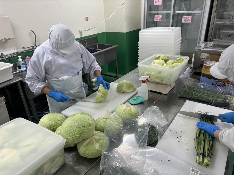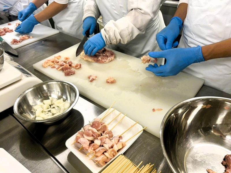 自社食品工場で冷凍餃子の製造・焼き鳥の串打ち