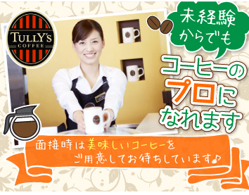 求めている人材 【どんな方でも一度ご応募くださいね♪】 ◇飲食業界、接客未経験も大歓迎 ◇コーヒーに興味がある方・学びたい方 ◇接客に興味がある方 ◇オシャレなお店で働きたい方 ◇キャリアアップを目指している方 ◇早起きが得意な方 ◇午前中を有効に使いたい方 【タリーズの特徴】 落ち着いた雰囲気のインテリアで統一された店内は ゆっくりとコーヒーを味わったり、 お客様がくつろげる空間となっています。 オススメのメニューをご案内したり、 好みを伺ってお客様に合うドリンクをご提案したり、 スタッフも必要な接客はしっかりと行いますが 売りたい商品を押しつけるようなことはしません。 あなたも落ち着いた丁寧な対応を心がけてください。 FC店舗ではありますが、店舗のディスプレイや POPの設置などはお店ごとに異なります。 スタッフがアイデアを出し合って、 お店づくりを行えるのもタリーズの特徴です◎ 【キャリアアップもおおいに可能】 働きながらコーヒーアドバイザー(社内資格)、コーヒーマスター(社内資格)の資格取得なども目指せます◎ また、経験を積めば時間帯責任者、アルバイトトレーナー、アルバイト・パートの教育やシフト調整などを行う副店長(社員)、店舗経営全般を担う店長(社員)へとステップアップも可能です! 【ここはお願いしますね!!】 季節ごとに変わるドリンク・フードメニューのこと、豆の知識、美味しいコーヒーの淹れ方など、入ってからは覚えることがたくさんあります。 教育体制が万全とはいえ、あなたにも積極的に学ぶ姿勢をもってほしいと思います。 まずは仲間とコミュニケーションをとることを大事にしてください!!