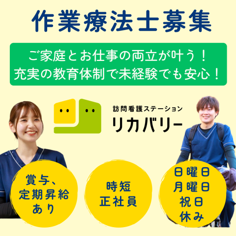 「時短常勤・日月祝日休み」訪問リハビリ未経験でも安心!ご家庭とお仕事を両立できます!待遇充実◎ 訪問看護ステーションリカバリーでは、時短正社員の作業療法士スタッフを募集しています。 ・日、月、祝日休み ・フルタイム常勤と変わらない待遇 ・ご家庭とプライベートを両立できる ・副業も可能 「当社について」 Recovery International株式会社は、2013年に創業し、都内を中心に全国で訪問看護サービスを展開しています。 “もう一人のあたたかい家族”という理念を掲げ、24時間365日対応できる体制で在宅生活の安心を届け、地域社会へ貢献することを目指しています。 また、スタッフがチームで“いきいき”と働くことができるよう、働きやすい環境づくりを構築しています。 訪問看護事業のみで株式上場している唯一の会社です。 「リカバリーはこんな所」 1.スタッフ8割の入職の決め手は“職場の雰囲気の良さ” 個々の意見を大切にしており、看護師とリハビリ職がお互いに相談しやすい環境です。 チームでいきいきと働くために、お互いに声を掛け、助け合えるあたたかい仲間が集まっています。 2.充実した教育フォロー体制 スタッフの92%が訪問看護未経験で入社しています。 皆さんが安心して訪問看護を始めるための教育体制を整えています。 3.ワークライフバランス充実 ICT活用による業務効率化、ルートの組み方の工夫による移動時間の短縮化を図っています。 福利厚生も充実しており、長く働ける環境が整っています! 4.「えるぼし認定(二つ星)」を取得 えるぼし認定とは、女性活躍推進に関する法律の一定基準を満たした優良な企業を認定する制度です。 全国の訪問看護事業所のうち、えるぼし認定企業は十数社のみ。都内だと数社であり、希少性がとても高いです。 会社全体の約7割が女性で、多くの女性スタッフが活躍しています。 ・引越し支援金20万円を支給いたします 現住所から配属先への通勤が難しい場合、転居する方を対象に一律20万円の支援金を支給しております。遠方より転居した多くのスタッフが活躍しています。 ※支給には条件がありますので、詳しくは下記をご覧ください。 ・「まずは説明会に参加したい」「体験同行したい」という方も大歓迎です。 ご応募・お問い合わせをお待ちしております!