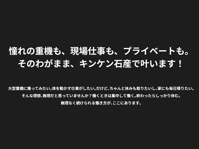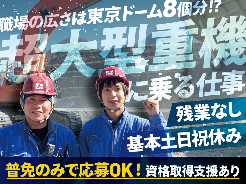 仕事内容 重機を操る”カッコいい仕事”を、始めよう! < 仕事も趣味も、どっちも全力で楽しむ > 安定収入とプライベートの充実を求める方へ *活躍するスタッフの9割が現場作業未経験 *遅くても「16:45」には終了!原則定時退社 *土日祝休み!趣味など自分時間もたっぷり *未経験入社4年目で「年収415万円」も可能 *資格取得支援で、入社後のスキル向上も! <<山を削り、岩を砕く。爆破もあり!>> ~ カッコいいだけじゃない、誇れる仕事 ~ あなたが砕いた石は、道路・橋・建物など、 地域のインフラの資材になります。 つまり、あなたの仕事は、街をつくり、 人々の暮らしを支える、貢献度の高い仕事! -------------------- 【 主な仕事内容は、下記作業の補佐! 】 (1)重機(破砕機)に搭乗し石を砕く …タイヤの大きさ170㎝超の超大型重機使用 砂・砂利の材料をつくる砕石作業をお任せ! ダイナマイトを使って山を削る瞬間は まさに派手な映画のワンシーンにいる気分! (2)石を砕く機械のメンテナンス 機械(プラント設備)が正常に動いているか、 錆びは無いかなどのチェック・整備・清掃! 【 使用車両(一例) 】 *大型油圧ショベル *大型ダンプ(32t) *ホイールローダー 他、操縦車両は多数! <現場は東京ドーム8個分の広大な採石場> スケールの大きさを肌で感じながら働けます \\ まずは簡単なことからスタート // 清掃やトランシーバーを使った連絡伝達など できることから徐々にスタートしましょう! 先輩のサポートのもとで実務を行いながら、 会社のことや用語など、ゼロから学べます! 【 研修あり! & 資格取得支援あり! 】 重機の操縦資格は入社~約3ヶ月で取得可! 資格を取得して「乗れる!」から「乗りこなす」 まで、先輩のサポートがあるのでご安心を! -------------------- \ 残業なし!暗くなったら作業終了! / <<スタッフや近隣住民の安全面に配慮>> 山を削るため、騒音や砂埃対策などの観点で 近隣の住民との厳重な約束ごとがあります。 周囲の理解がなければできない業務のため、 規定時間以降の作業は<<原則、禁止!>> 思いやりと、協力のもとで作業を行います。 また、重機やダイナマイトを使用するため、 明るいうちに作業を終えることが一番大切! だから、残業禁止&暗くなれば作業は終了! 荒天時なども作業できないためお休みです!