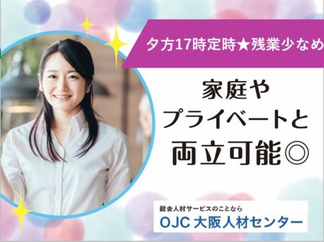 仕事内容 。.。:+* ゚ ゚ *+:。.。:+* ゚ ゚ *+:。.。.。:+*゚ ゚ *+:。.。:  ̄ ̄ ̄ ̄ ̄ ̄ ̄ ̄ ̄ ̄ ̄ ̄ ̄ ̄ 『ココ』がポイント ______________ メトロ&京阪&JRの3路線から通勤可能♪ 人気の「9時→17時」のお仕事★ 残業もありません◎ 。.。:+* ゚ ゚ *+:。.。:+* ゚ ゚ *+:。.。.。:+*゚ ゚ *+:。.。:  ̄ ̄ ̄ ̄ ̄ ̄ ̄ ̄ ̄ ̄ 仕事内容 __________ \専用フォーマットを使ってのカンタン事務♪/ メトロ&京阪&JRから通勤できちゃう☆ 人気の「9時→17時」の事務のお仕事* ≪お仕事内容≫ ◆見積書・請求書作成 ◆資料作成(社内資料など) ◆来客対応 ◆問合せ対応(メール) ◆郵送物の封入・発送 - 資料作成がメインのお仕事* フォーマット&過去資料もあって、不明点もすぐ確認OKな環境が◎ 庶務業務からスタートして徐々に業務を覚えていただきます 「17:00定時」で「残業なし」だから 家庭と両立したい方にもピッタリ♪ぜひお気軽にご相談ください* 。.。:+* ゚ ゚ *+:。.。:+* ゚ ゚ *+:。.。.。:+*゚ ゚ *+:。.。:  ̄ ̄ ̄ ̄ ̄ ̄ ̄ ̄ ̄ ̄ ̄ ̄ 就業先について ____________ 通勤ラクラク♪印刷関連会社です ・服 装:オフィスカジュアル ・環 境:禁煙環境 。.。:+* ゚ ゚ *+:。.。:+* ゚ ゚ *+:。.。.。:+*゚ ゚ *+:。.。: