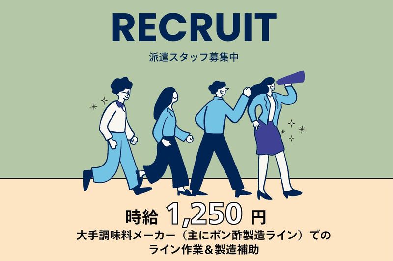 仕事内容 ◆仕事内容 大手調味料メーカー(主にポン酢製造ライン)でのライン作業&製造補助をお願いします。 製品の検品(異物混入やラベルのチェック) 調味料の計量やライン作業 製造工程の補助業務 未経験の方でも、先輩スタッフが丁寧に教えますので安心してスタートできます! ◆給与 時給:1,250円 ◆勤務時間 8:30~17:00 ※基本的に残業はありません。 ◆休日・休暇 年間を通して「日曜・祝日」は固定休み! 閑散期(2月~9月末):土日祝休み 繁忙期(10月~1月末):日祝休み(しっかり稼げます!) 有給休暇あり ◆勤務地・通勤 大阪府八尾市南太子堂 車通勤OK(敷地内駐車場あり/状況により別駐車場を利用いただく場合あり) ◆応募資格 未経験歓迎!男女問わず活躍できます コツコツ作業が好きな方 ※作業中はアクセサリー(ピアス・指輪・ネイルなど)を外していただきます 髪色自由で、個性を大事にしながら働ける職場です♪ ◆待遇・福利厚生 社会保険完備 車通勤OK(駐車場あり) 交通費規定支給 ◆こんな方におすすめ! 安定した企業で長く働きたい方 製造・軽作業に興味のある方 残業なしでプライベートも充実させたい方 コツコツ・モクモク作業が得意な方 ◎大手メーカーで安心&安定して働ける環境です。 未経験からスタートしたスタッフも多数活躍中! 少しでも気になった方はぜひお気軽にご応募ください♪