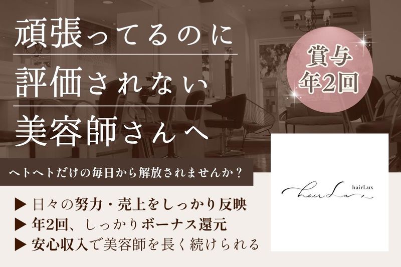 仕事内容 ■給与・条件 【スタイリスト(正社員)】 ・月収30万円以上(賞与年2回) ・土日休みOK/日曜固定休みスタッフ在籍 ・年間休日120日以上/有給完全消化 ・長期休暇 年3回/最長15日連休実績あり ・社会保険完備/産休・育休あり ・基本給 スタイリスト22万 アシスタント20万 スタイリストパート時給1500円 交通費1万円 歩合給+店販売10% 【2026年未経験スタイリストデビュー時1ヶ月目から歩合給6万支給しました。】 その他歩合3万円 残業手当1万円 ●美容業界では珍しい条件が揃っています ⸻ ■勤務時間 ・平日 9:30〜18:30(休憩60分) ・土日祝 9:00〜18:00(休憩60分) ・実働6時間〜8時間 ・平均勤務日数 月18日〜22日 ・時短社員在籍 ・パートスタイリスト在籍 →勤務時間は柔軟に相談可能 ⸻ ■休日・休暇 ・完全週休2日(月曜+希望休) ・年間休日120日以上(有給含む) ・土日休みOK ・日曜休みの働き方も可能 ・長期休暇 5日×年3回 ・最長15日連休実績あり ・有給休暇10日 完全消化 ・年末年始休暇 ・産前産後休暇/育児休暇 ・介護休暇 ・慶弔休暇あり ⸻ ■こんな悩みありませんか? ・回転重視でお客様と向き合えない ・掛け持ち接客で技術に集中できない ・忙しすぎてやりがいを感じにくい ・売上を上げても給料が上がらない ⸻ ■hairLuxの特徴 ・平均客単価18,000円以上の高単価サロン ・女性のお客様中心 ・新規入客あり ・無理な予約の詰め込みなし ・お客様一人ひとりと丁寧に向き合える ●入客数が多くなくても売上が作れる ●技術と仕上がりにこだわれる環境 ⸻ ■hairLuxの働き方 【働きやすさ】 ・土日休みOK ・日曜固定休みスタッフ在籍 ・長期休暇あり ・有給完全消化 ・生理休暇あり 【美容師としての働き方】 ・無理な予約は入れません ・お客様としっかり向き合える 【成長環境】 ・ミーティングは営業時間内 ・技術マニュアル完備 ・先輩スタッフがサポート ・営業時間外の練習/残業なし ⸻ ■求める人材 ・美容師の仕事が好きな方 ・技術を大切にしたい方 ・責任を持って働ける方 ・前向きで向上心のある方 ・チームワークを大切にできる方