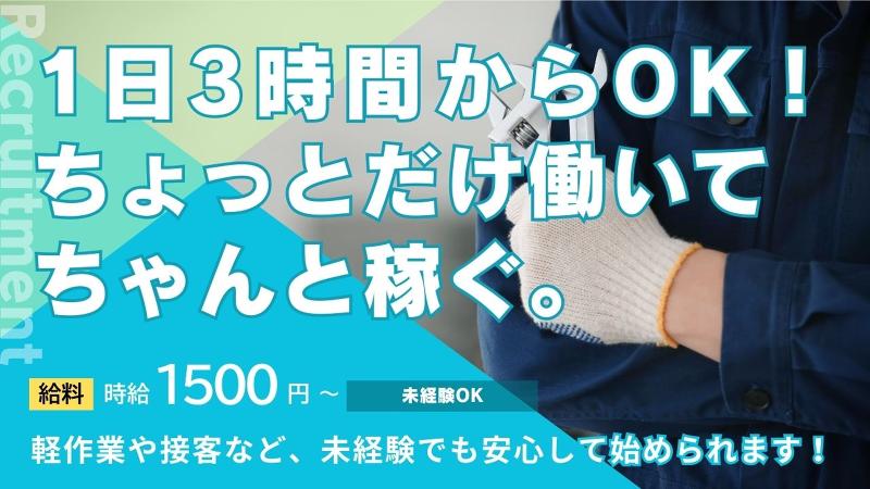 アピールポイント: この仕事、地味にここがいいんです! 裏方の仕事だけど、 お店の人やスタッフさんから 「毎回ほんと助かる〜!」 「あなた達が来ると安心するんだよね」 って言ってもらえること、意外と多いです♪ 「今日もちゃんと役に立ったな〜」って思えます! 働きやすさもちゃんとあります! ・決まったお客様先を回るルート制 ・営業っぽいことは一切なし ・現場は1日2〜4件くらい ・重たい作業は社員さんが担当 ・基本はチーム制で一人きりなし 職場の雰囲気もかなり穏やかで、 ガツガツ系、体育会系のノリはありません! シフトはこんな感じです♪ 週3日からOK! 1日6時間くらいから相談できます! Wワークや副業とも両立できます♪ 「今月はガッツリ!」も大歓迎です! こんな人に向いてます! ・体を動かすバイトが好き ・機械や道具にちょっと興味がある ・人と話すのがそこまで苦じゃない ・飲食以外のバイトもやってみたい ・将来、正社員もちょっと気になる…! 応募について♪ 履歴書はいりません! 私服でそのまま来てOKです! 「とりあえず話だけ聞きたい…」でも大丈夫ですよ♪