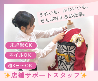 仕事内容 ⭐ 応募前に不安なあなたへ *。・  ̄ ̄ ̄ ̄ ̄ ̄ ̄ ̄ ̄ ̄ ̄ ̄ ̄ ̄ ̄ ̄ ̄ ̄ ̄ ̄ 『夢☆きらら』で活躍しているスタッフの ほとんどが、未経験からのスタート。 大切なのは、 「お客様に喜んでいただきたい」 という気持ち。 まずは笑顔でお客様をお迎えすることから はじめましょう♪ \\\ ✨この求人のポイント✨ /// ୨୧┈┈┈┈┈┈┈┈┈┈┈┈┈┈┈┈┈┈୨୧ ✅接客なし!裏方サポート業務 ✅マイカー通勤OK!無料駐車場あり! ✅土日時給1400円!平日より100円UP★ ✅週3日~OK!あなたのペースで働ける! ✅10時出社で朝もゆっくり♪ ✅ネイルOK!オシャレも楽しめる職場✨ ⭐お仕事内容 ୨୧┈┈┈┈┈┈┈┈┈┈┈┈┈┈┈┈┈┈୨୧ 店舗業務のサポートを お願いします。 ⭐具体的な仕事内容 ୨୧┈┈┈┈┈┈┈┈┈┈┈┈┈┈┈┈┈┈୨୧ ⏩店舗スタッフのサポート ⏩事務・店舗サポート ・簡単なPC入力 ・電話対応 ・店内ディスプレイ、清掃 ・商品整理や在庫管理 ⏩ ハレの日の準備サポート 前撮りや成人式当日に向けた準備のお手伝い。 お客様が安心して大切な日を迎えられるよう 心を込めてサポートします。 ⏩ハレの日の準備サポート 前撮りや成人式当日に向けた準備を お手伝い。 安心して大切な日を迎えていただけるよう 心を込めてサポートします。 ⭐ 夢☆きららについて ୨୧┈┈┈┈┈┈┈┈┈┈┈┈┈┈┈┈┈┈୨୧ 私たちが運営する『夢☆きらら』は、 有名女優・モデルがイメージモデルを務める 振袖・袴のレンタル&販売専門店です。 ⭐応募していただく皆様へ*。・  ̄ ̄ ̄ ̄ ̄ ̄ ̄ ̄ ̄ ̄ ̄ ̄ ̄ ̄ ̄ ̄ ̄ ̄ ̄ ̄ 「接客はちょっと不安…」 「人前に立つ仕事は苦手…」 そんな方も大丈夫です◎ 今回募集するのは 接客なしのサポートポジション。 お任せするのは、 店舗を支える“裏方業務”です。 未経験からスタートしたスタッフも多数♪ 特別なスキルは必要ありません。