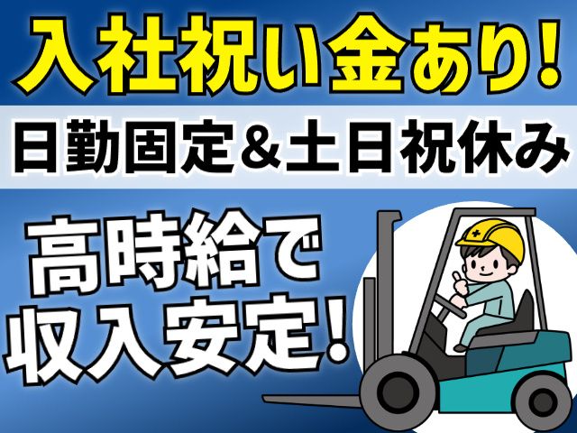仕事内容 <入社祝い金 総額6万円支給!> 1ヶ月毎に1万円ずつ支給! (社内規定あり) <おすすめポイント> ・高時給1,270円 ・日勤固定 ・土日祝休み ・昇給、賞与あり ・20代~50代前半の男性活躍中 <お仕事について> 工場にて、フォークリフト業務及び木材出庫作業をお任せします。 製造業、木材の運搬が未経験でもイチから丁寧に教えますのでご安心ください。 入社時研修やOJTなど、研修制度も充実! もちろん、工場・倉庫内作業経験者は即戦力! <勤務地について> 加美郡加美町の工場 マイカー通勤OK! 駐車場完備しています! <高時給でしっかり稼げる> 時給1,270円×フルタイムで日勤でも高収入! 安定して働けます。 <プライベート充実> 日勤固定、土日祝休み! 家族や友人と予定が合わせやすいのも嬉しいポイント! メリハリをもって働けます。 <幅広い年代の男性活躍中> 20代の若い世代~50代前半の中高年世代まで活躍中の職場です! 50代後半以上の方もご相談ください。 <こんな方におすすめ> ・フォークリフト資格取りたて、ブランクがある方 ・経験を活かして新しい環境で働きたい方 ・夜勤から日勤固定の仕事に転職したい方 ・プライベート重視で働きたい方 など <派遣が初めてでもOK> 正社員・パート・アルバイトからの転職もOK! 現場での不安ごとや悩みも、ぜひ当社社員にお気軽に相談してください。 ご応募お待ちしております!