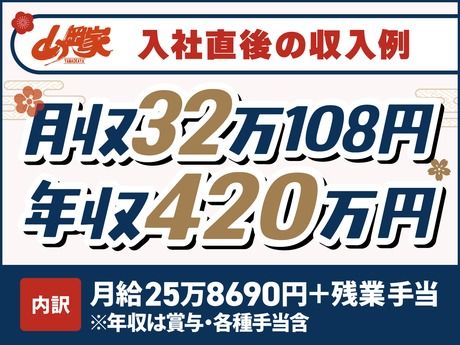 仕事内容 【週休3日制の正社員は、転居を伴う転勤なし】 深夜でも多くのお客様にご来店いただく山岡家。 ◆夜型の生活スタイルで、 プライベートの時間も安定収入も得たい方 ◆飲食店経験や接客スキルを活かしながら、 負担を抑えて働きたい方 …などにオススメ! <夜勤専従で高収入!> 入社1年目で、年収例420万円可能!! 家族との時間も自分時間も 圧倒的に増える働き方で、高収入スタート◎ ====================== \ オススメPOINT 1 / 【22時~出勤、週休3日×年間休日156日】  ̄ ̄ ̄ ̄ ̄ ̄ ̄ ̄ ̄ ̄ ̄ ̄ ̄ ̄ ̄ ̄ ̄ ̄ ̄ 働き方改革の一環として導入した、 「週休3日制・夜勤専任」の正社員制度。 転居を伴う転勤がなく、地元でライフスタイルに 合わせた働き方が可能になりました! 住み慣れた場所で長く働きたい方や、 家族との時間をゆったり取りたい方にも◎! \ オススメPOINT 2 / 【東証スタンダード上場企業の安定基盤】  ̄ ̄ ̄ ̄ ̄ ̄ ̄ ̄ ̄ ̄ ̄ ̄ ̄ ̄ ̄ ̄ ̄ ̄ ̄ ■残業代は1分単位で全額支給(みなし残業なし) ■昇給・賞与は年2回!! ■プライベートの都合に考慮したシフト希望休、 有給の取得も可能!(土日・連休の取得もOK) ■男性社員の育休取得実績もあり! ====================== 【お仕事について】 まずはホール業務からスタートし、 店舗全体の流れや雰囲気をつかみます。 その後、キッチン業務や洗い物、 仕込みなども担当していただきます。 <将来的には…> 接客・調理だけでなく、 衛生管理・設備管理など、店長不在の 時間帯の店舗運営も含めてお任せをします。 \\ 段階的に学べるので安心! // ◆冊子のマニュアルや、店舗のタブレットでも 視聴できる動画教材などをご用意。 何を・どの順番で覚えればいいかが明確で、 着実にステップアップできます! ◆全店舗、食券制&設備が整った店内。 丁寧な接客と、スープ・ネギ・チャーシュー すべてを「お店で手作り」にこだわる山岡家の スタイルに集中しやすい環境です! ※接客・マニュアル・動画はすべて日本語です。 ====================== 【週休2日制へのキャリアチェンジも可能】 まずは週休3日制でプライベートと両立。 「もっと働きたい」「キャリアを積みたい」と 思ったら、週休2日制へ転換もできますよ! 実際に、働き方を変えながら キャリアアップを叶えた社員も在籍しています。 <キャリアチェンジした社員の声> 「子育てと両立しやすい週休3日制の夜勤で入社。 家庭と両立できる範囲での異動など、 柔軟に対応してもらえたので安心して働けました。 そのうちに仕事が楽しくなり、週休2日制の キャリアコースへ転換。キャリアアップが叶い、 今では店長として活躍しています!」 *店長職の収入例 年収560万円(月給41万円+賞与年2回+各種手当) ====================== 【丸千代山岡家について】 全国に190店舗以上のラーメン店を運営中。 売上好調!前年比平均10%以上の成長率! 47都道府県への出店を目指し、新店OPENも続々。 セントラルキッチンを設けず 全店直営&店内手作りにこだわる姿勢で、 根強いファンもたくさんいます! リピート率はなんと75%超え!(自社調べ) <売上高> 186億7600万円(2023年1月期) 264億9400万円(2024年1月期) 345億8500万円(2025年1月期)*前年比130.5%! 《HP》https://www.yamaokaya.com/ 《採用HP》https://recruit.yamaokaya.com/
