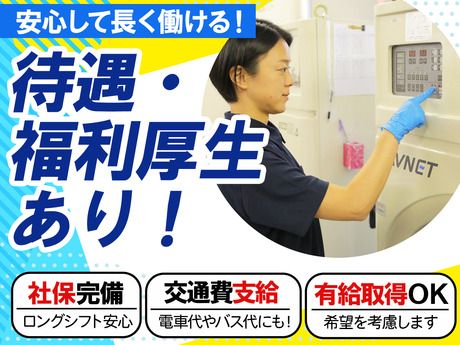 【保険制度】 雇用保険、労災保険、健康保険、厚生年金 待遇・福利厚生 【福利厚生】 【安心の福利厚生】 ――――――――――――――― ■社会保険完備 ■長期休業収入補償保険 (※社会保険加入者のみ/満60歳まで) ■労災補償上乗せ保険 (※労災保険加入者のみ) ■インフルエンザ予防接種 ■制服貸与 【お給料にプラスの手当】 ――――――――――――――― ■昇給あり ■残業手当 ■交通費規定支給 【お休み・休暇制度】 ――――――――――――――― ■有給休暇 (入社6ヶ月経過後、最大10日付与) ■特別有給休暇 ■時間単位有給休暇 ■積立有給休暇 ■産休・育児休暇 ■通院休暇 (妊産婦健診受診時)