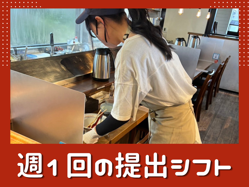 仕事内容 \平日昼だけOK!急なお休みも対応◎/ 平日昼週3日以上勤務で時給1,200円! <<家庭優先で働ける環境です◎>> お子さんの体調不良など 急なお休みも気軽に相談OK! 1週間ごとのシフトで予定も組みやすい♪ 【お仕事内容】 お席のご案内・配膳・片付けなどの 簡単なホール業務と、 盛り付けや洗い場などのサポートをお願いします! ★注文伺いはありません! →接客少なめで未経験の方も安心◎ ~入社後の流れ~ まずは簡単な作業からスタート。 イチから丁寧に教えるので、 飲食未経験の方も安心です♪ 仕事に慣れてきたら 調理補助にも挑戦できます! <働くスタッフの声> 30代/子育て中(入社6ヶ月) 子どもの体調不良で急に休むことがあっても、嫌な顔せず対応してもらえるのが本当に助かっています。 同じような主婦の方も多く、働きやすいです◎ 大学生(入社1年) 授業やテストに合わせてシフト調整できるので、無理なく続けられています! 接客も少なめで働きやすいです◎ ☆30代〜40代の主婦さん活躍中! ブランクがある方も大歓迎◎ ☆今春卒業スタッフが4名いるため増員募集! シフトに余裕があり、安定して働けます♪ 美味しいまかないも魅力! \学生さんも歓迎!/ 土日や授業終わりの勤務も可能です◎ テスト・サークル・かけもち先など 都合に合わせてシフト相談OK!