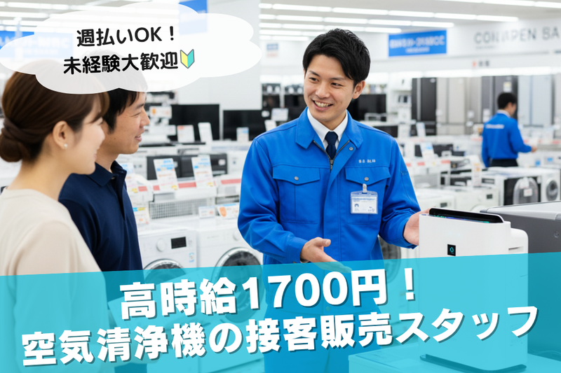 仕事の内容 \快適な室内環境を提案する、空気清浄機のコンサルタント/ 家電量販店にて、有名メーカーの空気清浄機など、快適な生活空間づくりをサポートする製品の接客販売をお任せします。 「アレルギー対策をしたい」「部屋の空気をきれいに保ちたい」といったお客様の健康ニーズをヒアリングし、最適な製品をご提案します。 専門知識は1ヶ月の研修で基礎から学べるため、未経験の方も安心してスタートできます。 【具体的な業務内容】 ・接客・製品デモ:お客様へのお声掛けと、空気清浄機などの製品機能やメリットのご案内。 ・ニーズヒアリング:お客様の環境や悩みをヒアリングし、最適なおすすめ製品を提案。 ・販売・事務処理:伝票作成、配送手配、セールやキャンペーン内容のご案内。 ・売場サポート:商品の整理整頓、清掃、日報や引継ぎメモの記入。 【✨ココが魅力!✨】 ✅ 高時給1,700円〜1,850円! 経験や成果に応じた昇給チャンスが随時あります。 ✅ 週払いOK! 働いた分をすぐに受け取れ、急な出費にも安心。 ✅ 食堂あり! かけそば・うどんが350円で食べられ、ランチ代がお得に。 ✅ 残業月20時間以内! ワークライフバランスを大切にできる。 ✅ 充実の研修制度! 1ヶ月間のOJT研修で商品知識と接客スキルを習得できます。 ✅ 40代以上も活躍中! 販売・接客経験を活かしたいブランクのある方も歓迎。 少しでも気になった方は、ぜひお気軽にご応募ください✨ 「話だけでも聞いてみたい」そんな気持ちでも大歓迎です!