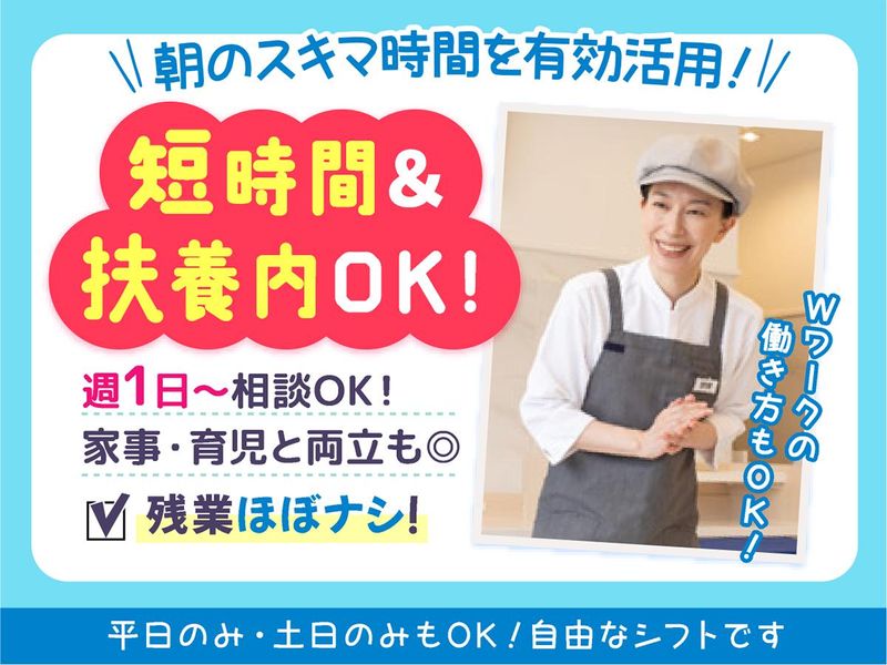 勤務時間詳細 早番/05:30~09:30 遅番/06:00~10:00 ★週1日~曜日相談OK! 週4~5日など沢山働きたい方には 優先シフトもあり! ★土日祝のみもOK!積極採用中 希望のシフトをご相談下さい。 お子さんの学校行事など シフトの調整も可能です! 家事×仕事が両立しやすい環境で みんなノビノビ働いています!