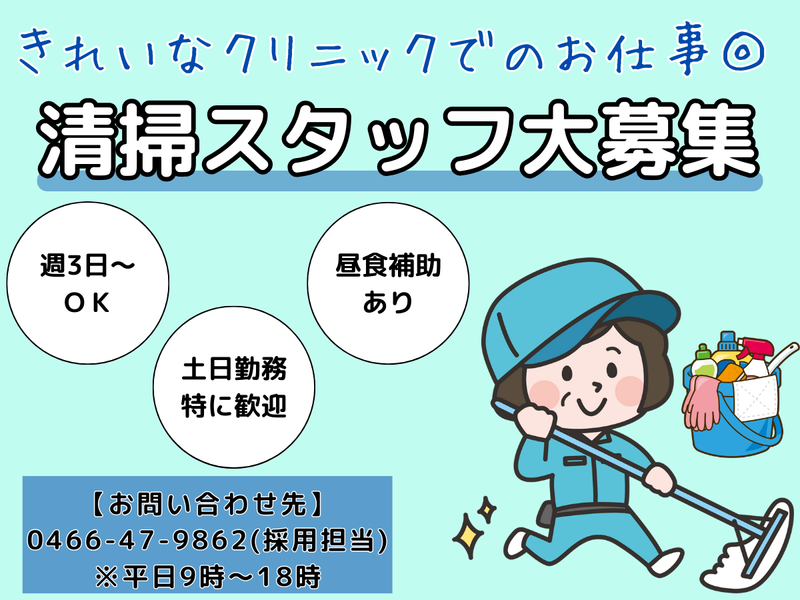 仕事内容 +.・。+.・。+.・。+.・。+.・。+.・。 ⛅未経験歓迎!経験者ももちろん歓迎! ⛅午前のみの勤務でWワークにも◎ ⛅扶養内勤務可能!主婦パート活躍中♪ ⛅中高年・シニアも多数活躍中✨ ⛅週3日から勤務OKで無理なく働ける! ┗土日勤務できる方特に歓迎◎ ⛅昼食補助あり♪お弁当が半額に…✨ +.・。+.・。+.・。+.・。+.・。+.・。 【仕事内容】 クリニック内の清掃業務をお願いします。 ✅モップや掃除機での床清掃 ✅手すりなどの拭き掃除 など 重機など専用機械の使用がなく、 日常の掃除スキルを活かせる作業ばかり! 清潔感ある綺麗なクリニックなので 清掃しやすく”キレイ”を保てます◎ 清掃業務未経験の方も歓迎します! 先輩スタッフがしっかりサポートするので 安心して業務に取り組んでいただけます。 オフィスビル清掃や商業施設清掃、 工場清掃など清掃員としての勤務経験が ある方はスキルを存分に活かせます! 汚れが取れやすくなるコツ等も学べて 私生活でも活かせますよ✨ ――――――――――――――――――― 【 アクセス詳細 】 ⏩湘南台駅東口スグ!徒歩1分で通勤楽々! 大型スーパー脇を抜けてすぐ◎ 六会日大前駅、下飯田駅、ゆめが丘駅、 長後駅、いずみ中央駅等からもアクセス便利