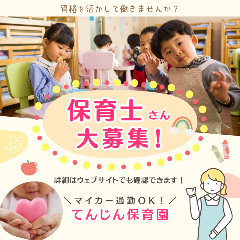求めている人材 求める人材: 【 こんな方は是非ご応募お待ちしております!】 ・子どもが好きな方 (子育て経験も活かせます) ・チームワークを大切にする方 ・子どもたち一人ひとりに ・愛情もって見守る保育をしたい方 ・ご希望する働き方を選べます (ご希望を考慮しながらシフトを組みます) ・長期でお仕事をしたい方 未経験の方やブランクある方も職員が丁寧に指導しますのでご安心ください。