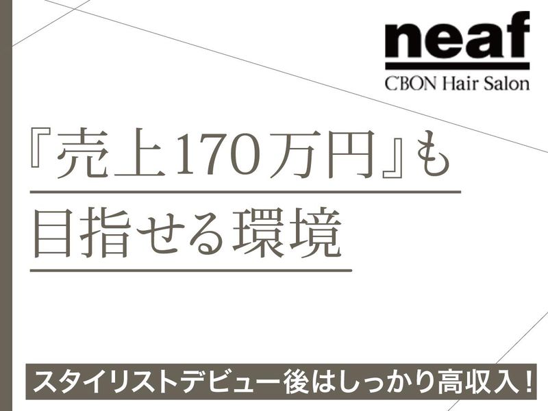 求めている人材 【必須】 ・美容師免許 【歓迎】 ・教育体制の整った環境で成長したい方 ・将来を見据えて安定した職場で働きたい方 ・チームワークを大切にできる方 ・美容に対して高い意欲を持てる方 【こんな方に◎】 ・今のサロンで成長実感が持てない方 ・働き方や将来に不安を感じている方 客単価14,000円というハイクラスな環境で、質の高い接客と技術を身につけませんか? 「しっかり遊び、本気で働く」のがneaf流。 自分の時間を大切にしながら、活き活きと輝ける場所で一緒に働きましょう!