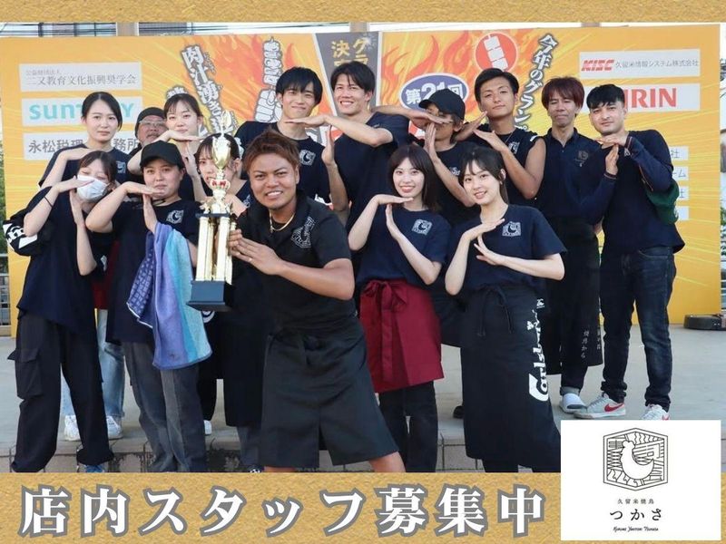 仕事内容 ■■■■■■■■■■■■■■■■■■■■■ ”つかさ”と”有馬”の2店舗でスタッフ募集中! 美味しすぎると好評のまかないあり✨ シフトの融通も利く、働きやすい環境です◎ そしてなんと! 福利厚生でトレーニングジム無料で利用可能! ■■■■■■■■■■■■■■■■■■■■■ 《✨ココがスゴイ✨》=========== 当店ならではの特典として、 系列店の”美容脱毛サービス”を利用できたり、 ”プライベートサウナ”でリフレッシュすることも可能! 他にはない福利厚生で働くモチベもUP♪ ====================== 【お任せしたいお仕事】 焼鳥居酒屋でのホール業務を中心に、 下記の業務をお願いします。 (具体的には…) ●お客様のご案内 ●お料理・ドリンクの提供 ●テーブルの片付け ●レジでのお会計 ●ドリンク作り ●簡単な調理サポート など。 ✅注文はタッチパネル式でラクラク♪ 聞き取りミスの心配が好きなく、未経験でも安心♪ ✅明るい挨拶ができれば、スタートラインはOKです♪ ╭━━━━━━╮ ⭐ココに注目⭐ ╰━v━━━━╯ ➰希望に合わせて働ける柔軟シフト 週2日~相談でき、授業やプライベートとの両立も◎ 短時間だけ働きたい方も、がっつり入りたい方も大歓迎! ➰スタッフ絶賛のまかない付き ボリューム満点のまかないが人気! タイミングが合えば串メニューも…!? 「まかない目当て」なんて方も実は多いんです(笑) ➰駅チカの便利な立地 西鉄久留米駅から徒歩1分。 周りにはコンビニ・スーパー・ドラッグストア・カフェなどが揃っていて、 勤務前後にも便利な環境です。 仕事帰りのサラリーマンからカップル、友人同士、ご家族連れまで 多くのお客様に愛されるお店で、一緒に働いてみませんか?