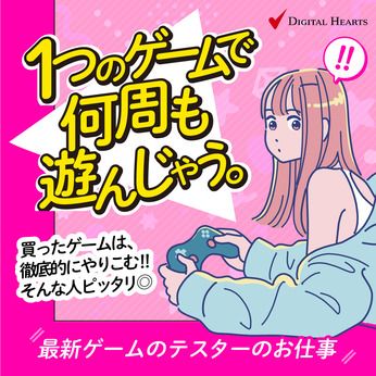 仕事内容 □■ココに注目!■□ *趣味を仕事に!ゲーム・パチンコのテスター! *平日のみ週3日~OK♪週5日勤務歓迎! *Wワークやプライベートと両立が可能! *服装・髪型・髪色自由!ネイルやピアスもOK! ※短期、短時間は不可となります >>思わず没頭するレアバイト!<< 発売前の最新ゲームやパチンコ、スマホアプリ、WEBサイトなどを実際にプレイ&体験!バグや不具合がないよう、徹底的にやり込んでチェックするテスターのお仕事です。あの大人気シリーズや名作ゲーム、いつも行く店舗でもお馴染みのパチンコ台、有名ソーシャルゲームなど、誰もが知っている&注目の様々な作品に発売前から携われるチャンスです! ~お仕事の流れ~ [1]発売前のゲームやパチンコを、仕様書に沿って操作。 [2]バグや不具合を発見! [3]バグ発生の経緯や状況を詳しくまとめてリーダーに報告! ~バグや不具合の例~ *ストーリーが急に止まって動かない *キャラクターが変な動きをしている… *ゲーム内のお金を無限に増やす方法がある *特定のボタン操作でゲームが落ちる など *ゲームやパチンコが下手でも問題ありません! *同じ趣味の仲間達とチームを組んで進めるので安心♪ 普段は遊ばないようなジャンル・タイトルやプレイスタイルを経験することも!新しいジャンルにハマったり、テクニックが身に付いたりと、趣味が広がる新しい発見があるかもしれません。また、同じ趣味の仲間が増えるので、仕事も休憩中も楽しく過ごせます! >>こんな方にオススメ♪<< 「せっかくなら好きなことを仕事にしたい」 「将来はゲーム業界で働くのが夢」 「コツコツ集中して作業するのが得意」 ⇒そんな方には天職!ぜひ、一緒に未来のプレイヤー達の快適なゲームライフを守っていきませんか♪ >>さらに詳しく知りたい方は…<< ↓ぜひこちらもご覧ください! https://www.digitalhearts.com/ ★これまでのタイトル実績例も掲載中! □■思い出に残る!たくさんのやりがい■□ 「工夫することで狙い通りのバグを発見できた!」 「ゲームがさらに面白くなるアイデアが出た!」 「チームで大きなプロジェクトを達成!」 「有名タイトルのスタッフロールに名前が載った♪」 など、日々達成感や自己成長を感じながら働けます◎未経験からでもゲーム業界で経験を積むことで将来のステップアップにも役立ちますよ! □■アニメ・マンガ・映画好きも多数!■□ 20代・30代の仲間が中心となって活躍するオフィス。ゲームやパチンコはもちろん、アニメ・漫画・映画・音楽などが好きな仲間や、推し活をする仲間なども多数活躍中!「私もコレ好き!」などの会話で盛り上がれます◎綺麗な新しい休憩室もあり、ゲームを持ち寄って休憩中に遊ぶこともOK!仕事も休憩もゲーム三昧…なんてことも♪ □■自分に合ったシフトで働こう◎■□ 平日週3日~5日勤務OKの登録制アルバイト!ライフスタイルに合わせて働けるため、Wワークをするフリーターや、扶養控除内で働くスタッフも活躍中! 他にも服装・髪型・髪色自由で、ネイル・ピアス・カラコンなどもOK!オシャレに力を入れたい日も、ラフな服の日も、気分に合わせて自由に楽しめます♪ □■バイトデビューを応援します!■□ オフィスワーク系のお仕事やバイト自体が初めての方も歓迎!実際に95%が業界未経験からのスタートです◎面倒見の良い先輩・リーダーばかりなので安心して成長できますよ。未経験からゲーム業界にチャレンジしませんか? 意欲があれば、正社員登用制度でレベルアップすることも可能!好きな仕事で長く安定して活躍できます◎