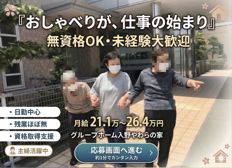 仕事内容 ✨仕事内容✨ グループホームでの介護業務をお願いします。 難しい仕事はありません!! 「グループホームって、他の施設と何が違うの?」 そんな疑問をお持ちの方も多いはず。 実は、グループホームは 「介護未経験の方」が 最もスタートしやすい環境の1つなんです。 - <具体的な業務例> 入居者様(最大18名)の 「日常」をサポートします。 #生活のお手伝い: 一緒にご飯を作ったり、 洗濯物を畳んだり、 お掃除をしたり。 #おしゃべり・レクリエーション: お茶を飲みながら昔話をしたり、 軽い体操や趣味の時間を一緒に楽しみます。 #身体のケア: 移動の際の手助けや、 食事・入浴・お手洗いのサポートなど。 - <ここがポイント!> #「手伝いすぎない」のが仕事です: 利用者様が「自分でできること」を 大切にするのがグループホームの役割。 何から何まで代わりに行うのではなく、 見守りやお手伝いが中心なので、 体力的な負担も比較的少なめです。 #まるで「大家族の家」のような雰囲気: 流れ作業のような対応は一切ありません。 「今日は天気が良いから少しお庭に出ましょうか」 といった、ゆとりある関わりが可能です。 ✨アピールポイント✨ 合計18人しか入所されていません!! #「普通の暮らし」を支えるお仕事です グループホームは、認知症の方が少人数 で共同生活を送る「家」のような場所。 大規模な施設のようなバタバタ感はなく、 お一人おひとりと向き合った 穏やかな時間が流れています。 #「介護」というより「家事の延長」からスタート 料理、洗濯、掃除、一緒にお散歩……。 特別なスキルより、 普段あなたが家で行っていることが そのまま仕事に活かせます。 #未経験・無資格でも安心のフォロー体制 「難しそう」というイメージを払拭する 丁寧な研修があります。 最初は先輩の横について、 ご入所様のお名前を覚えるところから始めましょう。