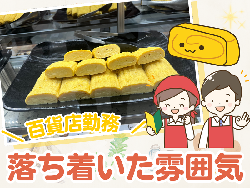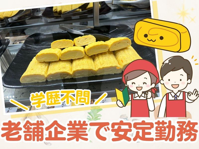 求めている人材 \ 未経験大歓迎 / ・ブランクがある方も歓迎! ・販売や接客業に興味がある・好きな方歓迎! ・正社員として安定して働きたいフリーターさん歓迎! ・百貨店での勤務に興味がある方歓迎! ・学歴不問!中卒・高卒の方もOK <下記に当てはまる方も歓迎> ・異業種からの転職を考えている方 ・右大臣の卵焼きのファンの方 ・ハローワークでお仕事お探し中の方 ・調理師やキッチンなど飲食の経験を活かしたい方