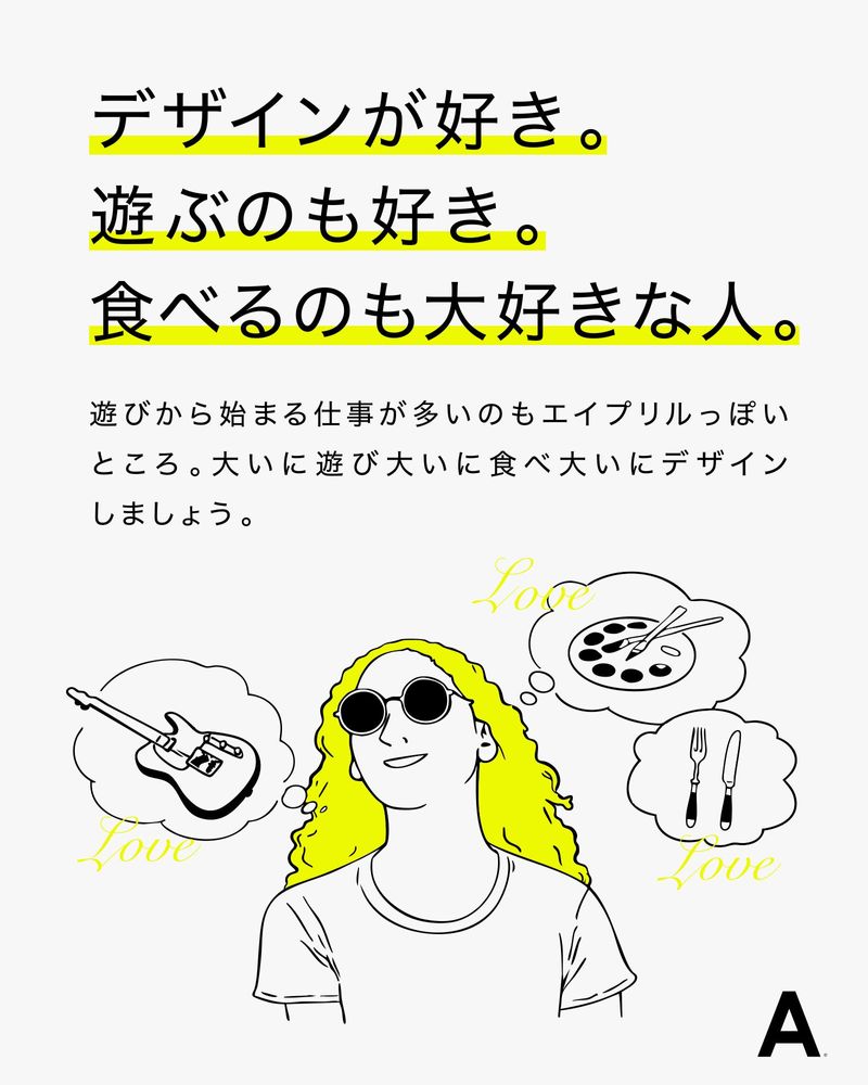 仕事内容 ◇◆──────────◆◇ デザインの経験を 共に活かしていきましょう ◇◆──────────◆◇ \アイデアは働きやすさから/ ―――――――――――――― ★完全週休2日制&土日祝休み ☆転勤なし ★補助・その他手当の充実 【業務内容】 企業やホテル、商業施設やレストランの ブランディングデザインが主です。 ・クライアントとの打ち合わせ ・撮影のディレクション・立ち合い ・Illustrator / Photoshop活用した デザインの作成・修正・データ納品 ・企画やアイディア出し 今までのキャリア(3年以上)を活かし、 即戦力として一緒に働きませんか? ━━━━━━━━━━━━━━━━━━ <株式会社エイプリルをご紹介> ▶【制作事例】 日曜日のクッキー、サムライ煎兵衛、The Johnson Store、土熊、Rising sun rock festival、F Village、mountainmanなど札幌市内を中心に全国の企業やショップ、レストランのブランディングに関わっています。実績はWEBをご覧ください。https://april-cr.com/ ▶【今後について】 企業のリブランディングや幼稚園のリブランディング、お土産物のパッケージ開発、都内レストランの立ち上げ、商業施設の開発など、話題を作り、世の中をおもしろくしていくためのデザインをどんどんしていきます。