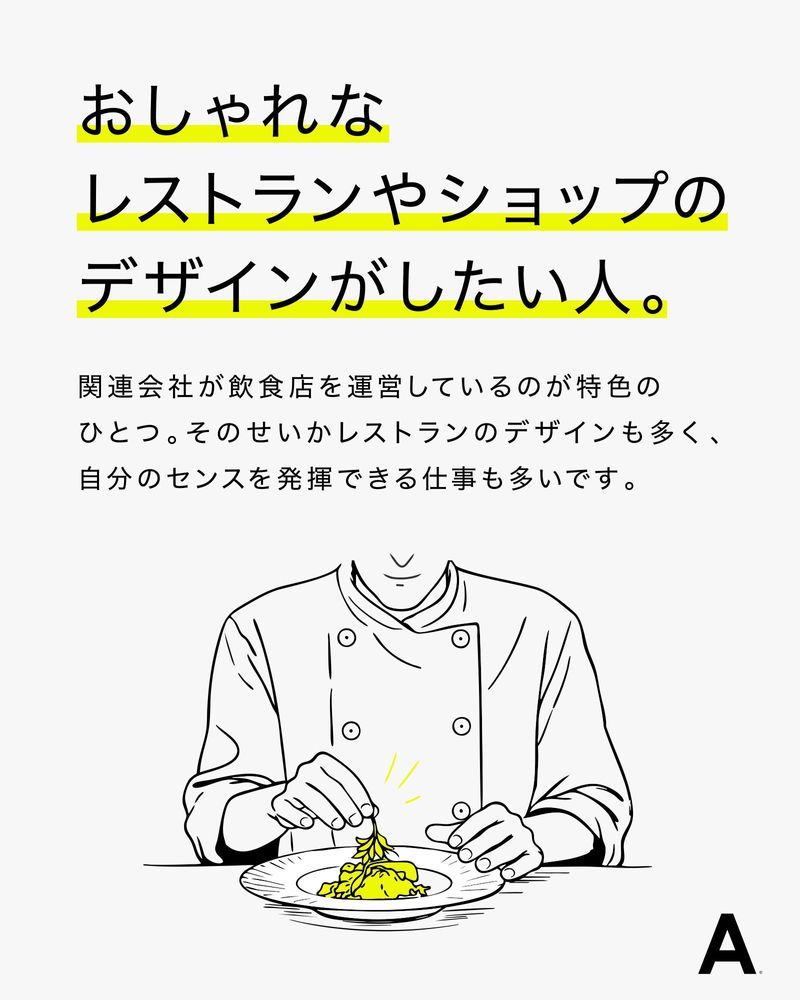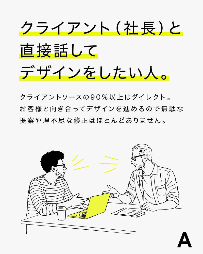 求めている人材 \\実務経験者 限定募集// 【必須】 グラフィックデザイナー ・Photoshop、Illustratorの実務経験3年以上 実務経験3年以上 アートディレクターやお客様と打ち合わせしながら、デザインを考え作っていける方を募集します。 ☆20代・30代を中心に活躍中 ★WEBデザイン・コーディングの知識があればばなお良し ≪こんな方も歓迎≫ ・札幌アートディレクターズクラブで入選したい!新人賞を獲りたい! ・おしゃれなレストランやショップのデザインの仕事がしたい ・クライアントと直接打ち合わせがしたい。デザインの結果が知りたい ・ブランディングの裏側を見てみたい ・デザインが好き、遊ぶのも好き、美味しいものも大好き ・将来絶対指名されるデザイナーになりたいetc. 目的・目標を持った方大歓迎です