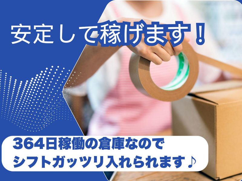 勤務時間詳細 9:00~18:00 ※フルタイムの勤務時間7.5時間 ※週4~5日勤務 364日稼働の倉庫なので 稼ぎたい方はガッツリと シフトを入れられますよ!