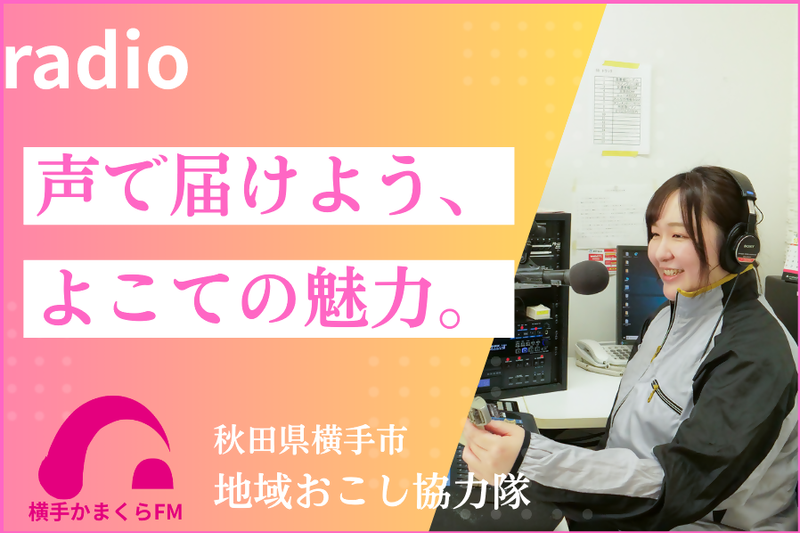 仕事内容 ー \充足次第募集終了です!/ 「少しだけ話をきいてみたい」 「ちょっとだけ興味がある」 そんな方へ。 まずはお気軽に応募ボタンから連絡、 又はお電話ください! ☎0182-38-8855 ー / 番組制作やラジオMC・SNSに興味のある方! あなたの発想を活かして町の様子や 文化、魅力を発信! 未経験から番組制作にも携われるチャンス! 秋田県横手市「地域おこし協力隊」大募集 \ 【当求人の魅力】 ★ ・・・・・・・・・・・・・・・・・・・・・・・・・ ★ ◇未経験OK ◇SNSが好きならOK ◇土日休み ◇自然の近くで過ごす ◇移住補助充実 └家賃最大5万円補助 ◇番組制作の1からすべてに携わる ★ ・・・・・・・・・・・・・・・・・・・・・・・・・ ★ 【仕事内容】 横手市の文化、風土、産業などの魅力を、 InstagramやYouTube等のSNSや、 イベント・ラジオ番組を通じて 発信するお仕事✧ 「やってみたい」を、ここでカタチにしませんか? 【具体的には・・】 ✧伝統行事やお祭りを番組や記事で紹介 ✧ラジオ番組の制作を通じた地域情報の発信 └ラジオパーソナリティにもなります! ✧地域イベントの企画・運営 ✧取材内容をSNSで発信(写真・動画も!) 着任した方のインタビュー  ̄V ̄ ̄ ̄ ̄ ̄ ̄ ̄ ̄ ̄ ̄ ̄ ̄ ■20代/女性 このお仕事はさまざまな文化を 肌で感じられます。 例えば、 『横手やきそばフェスティバル2025』で 取材を行い、横手の方々の 地元や横手やきそばの 温かい想いを感じほっこりしました。 また、学校での学習支援にも関わり、 横手市の文化を軸にした 魅力発信にも取り組んでいます。 SNSや動画制作が好きで メディア系の仕事に憧れていましたが、 「魅力発信」を基盤にスキルも磨きながら、 地域の様々な文化に携われるこのお仕事が大好きです!