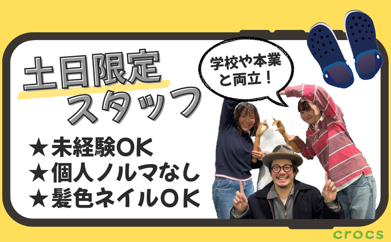 仕事内容 クロックスのPOPUPストアにて 新しい仲間を募集します! ≪土日専属スタッフを積極採用中≫ ー ✅未経験歓迎 経験や知識は不要! 事前研修もあり安心して働けます ✅髪色・ネイル自由 自由度高めなのが嬉しいポイント! オシャレも自分らしく楽しめます♪ ✅交通費全額支給 上限なしで全額支給! 出費をカットできて節約にも* ー 【お仕事内容】 ・接客販売品 ・品出し/商品陳列 ・在庫管理 ・レジ業務 ・梱包/ラッピング ・ディスプレイ ・店内清掃 まずは出来ることからはじめましょう! 笑顔とやる気があればOKです◎ ⭐制服貸出あり パーカーとシューズの貸出あり〇 下のボトムスは私服でOK! 実費での購入は不要です♪