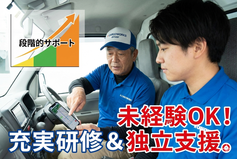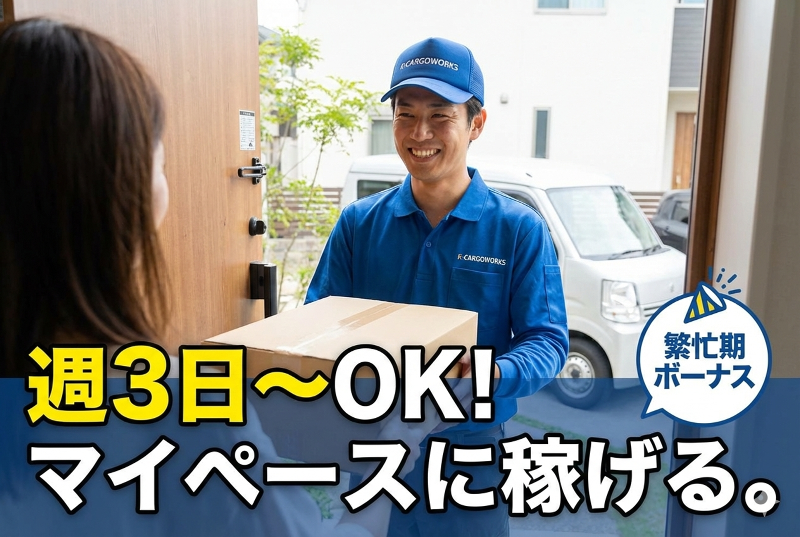 アピールポイント: ◆弊社だけのサポート体制があります!! 帰宅時間が『2時間変わります!!』 弊社はチーム力をモットーに『一人で早く帰る』ではなく、『チームで早く帰る』にフォーカスしているため、仕事が覚えられない、そんな不安はチームで解決していきます。 ◆しっかり稼げる!高額案件も目指せます! シンプルながら稼げる仕事。繁忙期にはボーナスもあります♪ 配達のスキルや経験を積むことで、高額案件へのステップアップが可能なため、やる気次第でどんどん報酬アップ! 将来の夢や目標を叶えるためのチャンスがたくさんあります。 ◆多彩なビジネスサポートで、独立へのステップを応援! 将来的に独立や起業を考えている方には、積極的に支援いたします。 当社は軽貨物事業だけではなく、様々な事業を展開しているため、多角的な起業サポートで成功への近道を提供します◎ 経験者から未経験者まで、新たな一歩を応援します! ◆未経験OK!手厚いサポートで安心◎ 未経験の方も安心してスタートできるよう、充実した研修&バックアップをご用意! まずは先輩社員の横乗りから始め、積み方や動き方を一通り覚えていただきます。 ◆週3日〜OK!一人でマイペースにお仕事♪ 勤務日数は週3日〜応相談可◎ 自身のライフスタイルに合わせて勤務できるので、Wワークやプライベートと両立が可能♪ 研修明けの配達は一人で行うので、自分のペースで作業が進められ、 自分らしいスタイルでお仕事ができます♪ ◆マイカーの持ち込み歓迎! マイカーを活用した配達もOK◎(社用車は軽バンを使用) 通勤も便利で、さらに効率的にお仕事をこなせます。 少しでも興味を持たれた方は、ぜひお気軽にご応募ください★ 未経験の方は、面談時に実際の業務を助手席に乗って見学可能です◎
