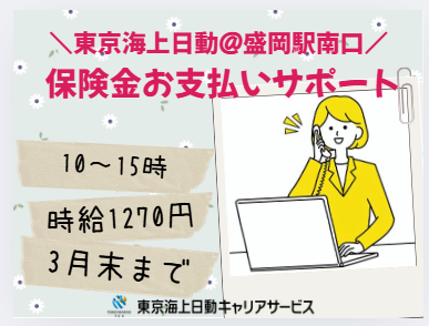 仕事の内容 \3月末まで期間限定/ ◆研修あり!保険の基礎知識やシステム操作確認してからスタート! ◆扶養内・フルタイム働き方選べます♪ @盛岡駅南口 【基本情報】 雇用形態:派遣社員 雇用期間:長期(3カ月以上) └26年1月~開始日相談可能 就業時間:10:00~15:00(休憩60分) └10:00~14:45×扶養内、17時定時×フルタイム…働き方選べます! 【必須条件】 ◆パソコン:基本操作(入力~修正) ※損保ご経験者、歓迎です 【お仕事内容】 ・保険金お支払い関連の書類作成 ・コピー、郵便の対応 ・電話取次 など 【こんな方にオススメ】 ・保険のお仕事に興味あり! →まずは期間限定で試してみたい方 ・ご家庭の事情で長期で働くのは難しい方 ・お子さんの登園・通学時間内で働きたい方 などなど! ◆3月末まで*繁忙による期間限定 ・終了後も東京海上グループを中心に、幅広くご案内をさせていただきます。 【環境面等】 @盛岡駅/最寄り駅から徒歩8分 東京海上日動の保険金支払いを担当する部署です ・20代・30代・40代・50代の多い職場 └幅広い年代活躍中/子育てに理解ある主婦(夫)が活躍中/TCS派遣スタッフさんご活躍中 ・穏やかで落ち着いた雰囲気 ・ランチタイムは休憩スペース利用OK └お弁当持参OKです ・オフィスカジュアル内で服装自由 【福利厚生等】 ・扶養内OK/社会保険完備→選べます! ・禁煙オフィス!煙苦手な方も安心 ・平日のみOK!土日祝休み ・年間休日120日以上&お休み相談可 ○●ご応募検討中の方へ●○ ・時短ご勤務で家庭やプライベートとの両立も◎ ・安定した環境で、無理なくお仕事したい方にぴったりの職場です!ご応募お待ちしています! ○●嬉しいPOINTたくさん!●○ 履歴書不要!開始日相談/期間限定/損保ブランクOK!保険未経験OK!研修あり安心スタート/残業なし/5時間以内の時短ご勤務/扶養内調整OK!