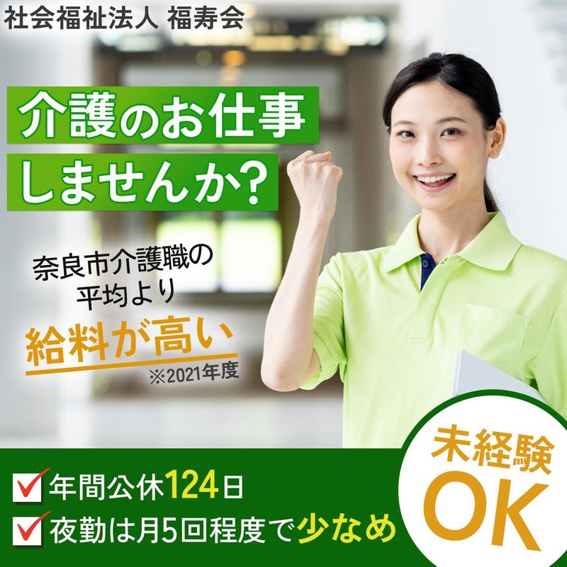 選考プロセス ⏩従業員増員中⏩ 福寿会では働きやすい環境を 整えています。 また、業績好調につき事業拡大 しており、増員募集中! あなたの力を必要としています。 !見学大歓迎! ご自身が働く職場であれば、 どんな施設なのか気になりますよね。 弊社では応募前の見学も大歓迎です! 多くの人に施設を見てもらいたい ので、お気軽にご連絡ください。 0742-45-9588 まで (採用担当:徳田) ※人材紹介会社経由での採用は 行なっていないため、ぜひ 直接のご応募をお待ちしております! ☆-☆ 当日はリラックスしてお話し いただけるよう、コーヒーやお茶 などのお飲み物をご用意してます ☆-☆ 【応募後のプロセス】 ・Webから応募→面接1回→採用 面接〜内定まで最短2日 私服面接OK! - <応募・お問い合わせ> (1)Webからの応募(24時間受付中) 応募後、折り返しご連絡 させていただきます。 (2)電話でのお問い合わせ 「求人を見た」とお問い合わせください 担当:(徳田) TEL:0742-45-9588 - ■会社概要 ・企業名:社会福祉法人福寿会 ・住所:〒631-0811 奈良県奈良市秋篠町1567 ・従業員数:283名 《事業内容》 ・特別養護老人ホームの経営 ・軽費老人ホーム(ケアハウス)の経営 ・老人デイサービスセンターの経営 ・老人介護支援センターの経営 ・老人短期入所事業の経営 ・老人居宅介護等事業の経営 ・介護予防・日常生活支援 総合事業の経営 ・障害福祉サービス事業の経営 ・移動支援事業の経営 ・保育所の経営 ■ホームページ https://fukujukai.or.jp ■応募情報の取り扱いに関して ご提供頂いた個人情報はお客様の 同意なく第三者に提供しませんので、 安心してご応募ください。 【居住介護求人】