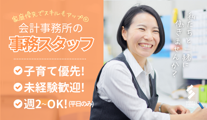 仕事内容 ⭐⭐11月に新事務所へ移転しました⭐⭐ ―――《募集要項カンタンまとめ》――― 【給与】時給1200円~ 【時間】8:30~17:30内で4h~相談OK 【日数】平日のみ週2日~相談OK 【休日】土日祝休み+夏季・年末年始休暇 「家庭最優先」で働きたい方大歓迎! 勤務開始日は柔軟に対応可能です! ★パートスタッフ希望の方も相談OK★ 【給与】時給1300円~ 【時間】8:30~17:30内で実働5h 【日数】平日のみ週4日で曜日相談OK ――――――――――――――――――― 「とにかく子育てに理解があって、 安心して両立できる環境がありがたい!」 そんな主婦さんの声多数!! ✅子育てや家事と両立して働きたい ✅子どもの行事や急な病気等は優先したい ✅未経験から事務デビューがしたい ✅すぐには働けないけど、今後働ける職場を探したい 一つでも当てはまったアナタに、 ぜひ読んでほしい求人です! ================== 【 この募集のPOINTまとめ 】 ================== 《POINT①》・・・・・・・・・・・・ ✨「家庭優先」で働きたい方歓迎!✨ お子様の急な体調不良や学校行事などは 最優先で大丈夫! 8:30~17:30内で1日4時間~&週2日~ 子育て優先の働き方が可能です! 平日のみの勤務で「土日祝休み」 職場では子育てママさん多数活躍中! 《POINT②》・・・・・・・・・・・・ ✨未経験で始めたい方も大歓迎!!✨ 8割の方が未経験でスタートしています! チームで仕事を進めており、 サポート体制は充実。 仕事についても、子育てとの両立も、 頼れる先輩がしっかりフォローします! お子様のご予定などに合わせて 勤務開始時期も柔軟に対応可能です♪ ==================== 【 お仕事内容について 】 ==================== 会計事務所での事務のお仕事です。 ★パソコンでのデータ入力・管理 ★来客対応 ★申請書類の電子申告・提出 ★伝票処理 ★経費精算 ★セミナーの準備 (メール対応/資料準備など) こちらの業務を全てお任せするのではなく、 あなたの適性や希望を考慮しながら お仕事をお任せしていきます! 【 未経験でも安心のサポート体制! 】 業務で使用するソフトウェアの操作方法等は マニュアルがあります。 業務を覚えていただくまでは先輩スタッフが 丁寧にサポート致します! 事務未経験の方も、 お久しぶりのお仕事をされる方も、 安心して始めていただける環境です♪ ╭━━━━━━━━━━━━━━━━╮ 「とにかく子育てに理解がある!」 ⭐そんなSS総合会計の魅力をご紹介⭐ ╰━━━━V━━━━━━━━━━━╯ SSグループは浜松市の中小企業様の 経営に向き合い続けて50年以上! 現在は総勢70名を超えるスタッフが 活躍しています。 業績も人材も成長中! そんなSS総合会計では、 子育てママさんも多数活躍中! 「家族との時間は大切にしたい」 「でも、限られた時間でお仕事もしたい」 私たちはそんなママさんを応援。 子育てと仕事の両立を叶えるため、 働きやすい職場環境作りに力を入れています。 ⏰働き方としては…⏰  ̄ ̄ ̄ ̄ ̄ ̄ ̄ ̄ ̄ ̄ ̄ お子様の病気や学校行事は”最優先”でOK! チーム制で仕事を進めており、 急なお休み希望の際にも「大丈夫よ!」と 温かくフォローできる体制が整っています。 《時間》 8:30~17:30内で1日4時間~相談OK! 《日数》 平日週2日~、曜日・日数相談OK! 平日のみの勤務で土日祝休み! 夏季休暇・年末年始休みもあります。 仕事とプライベート、メリハリをつけながら 働いていただける環境です♪ 休憩中には育児の相談や 先輩から仕事のアドバイスも聞けるので、 一人で不安を抱えることがない環境があり、 安心して働くことができます! ⚡ステップアップも可能です!⚡  ̄ ̄ ̄ ̄ ̄ ̄ ̄ ̄ ̄ ̄ ̄ ̄ ̄ ̄ ̄ 勤務を続けていく中で、 「子育てが落ち着いてもっと働きたい」 「家計を支えるためしっかり働きたい」 という方はステップアップも相談可能♪ <ステップアップの流れ> アルバイト・パート…1日4時間&週2日~勤務 ▼ アシスタントスタッフ…1日6時間・週5日勤務 (年収230万円~) ▼ キャリアスタッフ…1日7時間・週5日勤務 (年収350万円~) 生活スタイルやライフステージの 変化に合わせて、働き方を変えていく ことができますよ✨(規定による) ╭━━━━━━━━━━━━━╮ 【 STAFF INTERVIEW! 】 ╰━━━━V━━━━━━━━╯ ▼現在活躍中のスタッフさんの声をご紹介します! 「とにかく子育てに理解があり、家庭優先の環境が本当にありがたい!小さなお子さんがいるスタッフが多いのも心強いです。家庭の事情でお休みする際も、”大丈夫よ!”と声をかけてくれる暖かい職場です!」 「未経験で始めました!優しく明るい先輩方が業務を教えてくださるので、前向きに仕事ができる環境だと思います!」 「今までサービス業のお仕事をしていたけど、”事務のお仕事をしてみたい!”と思って始めました。子どもの成長に合わせて日数など働き方の変更ができることがいいなと思っています!」 * アパレル販売・化粧品販売・学校の先生・ 美容部員など… 現在活躍中のスタッフの前職はさまざま。 事務経験がな