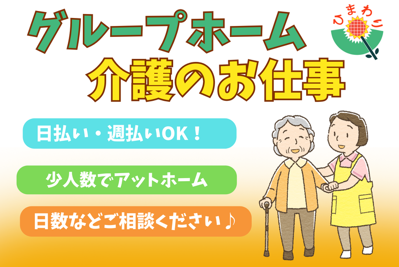 仕事の内容 《グループホーム》にて 介護スタッフさん募集! 特養内にあるグループホームです!(1ユニット) 午前のみでご家庭やプライベートと無理なく両立できます☆ 【この求人のポイント!】 ・週払い・前払いOK! ・30代・40代・50代活躍中! ・週2・3日~OK ・6:30~12:30のみ ・曜日・日数などご相談ください♪ ・無資格相談(経験必須) ・ブランクOK! ・マイカー通勤OK(駐車場無料) 【ひまわりのサポート体制】 ・お忙しい方やお電話が苦手な方はLINEでの相談OK ・多数案件あり/ご希望に合わせてご案内可能! ・専任のコーディネーターが、 お仕事探し~就業後のアフターフォローまで徹底サポート! ・面談・初日も同行するので安心◎ 【業務内容】食事介助、入浴介助、排泄介助、オムツ交換、移乗介助、余暇活動、記録、簡単な調理 等
