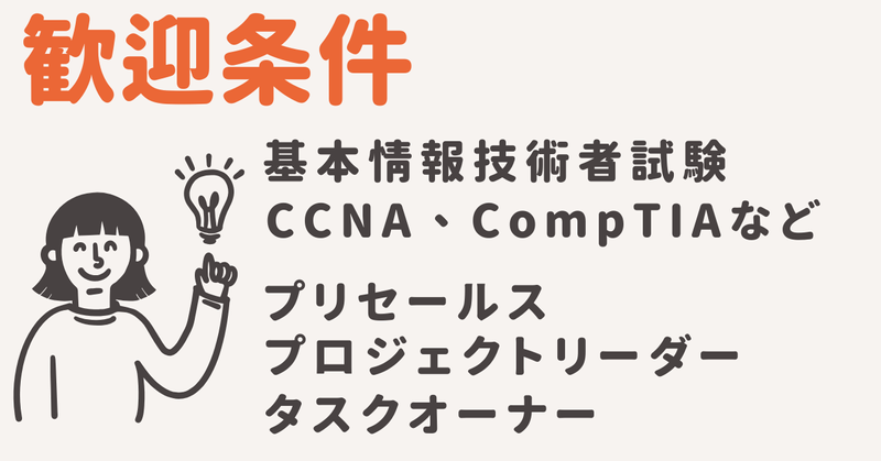 求めている人材 ■必須要件 ・ITインフラ(ネットワーク・クラウド・サーバなど)のご経験 ■歓迎要件 ・IT、NWに関する何らかの資格を取得されている方(基本情報技術者試験、CCNA、CompTIAなど) ・プリセールスなど対法人での顧客折衝がある方 ・プロジェクトリーダー/タスクオーナーなど、複数の関与者と共に業務を進めた経験がある方