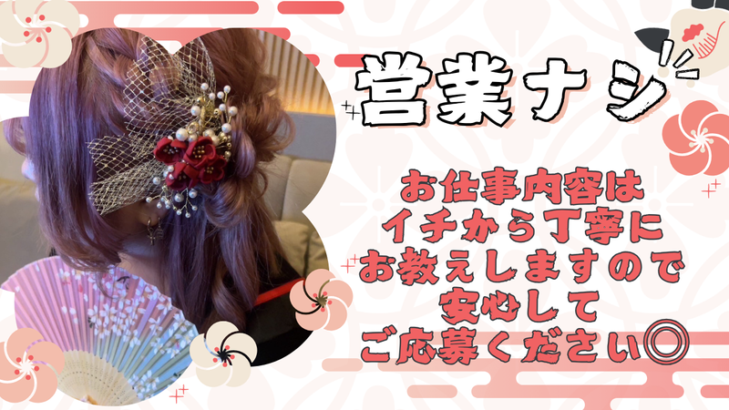 仕事内容 \\ 積極採用実施中! // ========================= ✨”3月中旬にオープンしたばかり”!✨ ========================= コンセプトはずばり✨花魁✨ 可愛い衣装を纏った女の子たちが 活躍するお店で、キャストさんのサポート をする「ホールスタッフ」を募集します♪ ✅業界・業種未経験でもOK! 先輩スタッフがイチからしっかりサポート しますので安心してご応募下さい◎ ●具体的には  ̄ ̄ ̄ ̄ ̄ ̄ ̄ *キャストさんのサポート業務 *簡単な調理・ドリング作成 *お客様のご案内・会計 などの接客業務全般をお任せします。 まずは1日の流れを覚えて 簡単な事からゆっくり覚えていきましょう! 現在活躍中のスタッフも ほとんどが未経験からスタート! 「人と話すのが好き・接客したい」 「とにかく稼ぎたい」それだけで十分です★