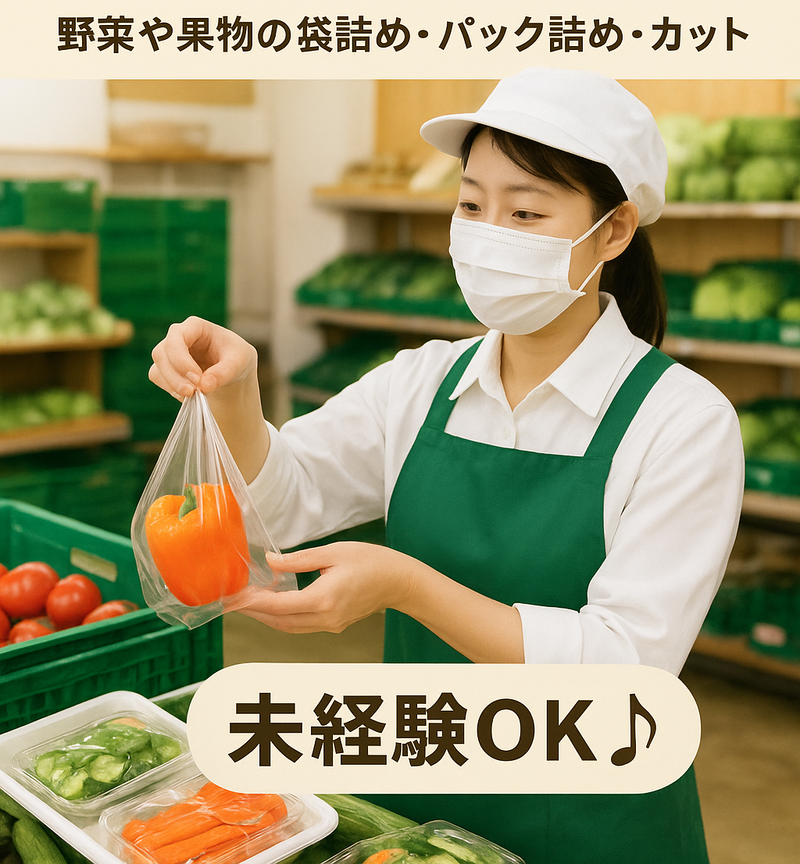 仕事内容 野菜や果物を袋に詰めたり、パックに並べたりする簡単な軽作業です。包丁を使ってカットする作業もありますが、難しい作業はありません。コツコツ作業が好きな方にぴったりのお仕事です。