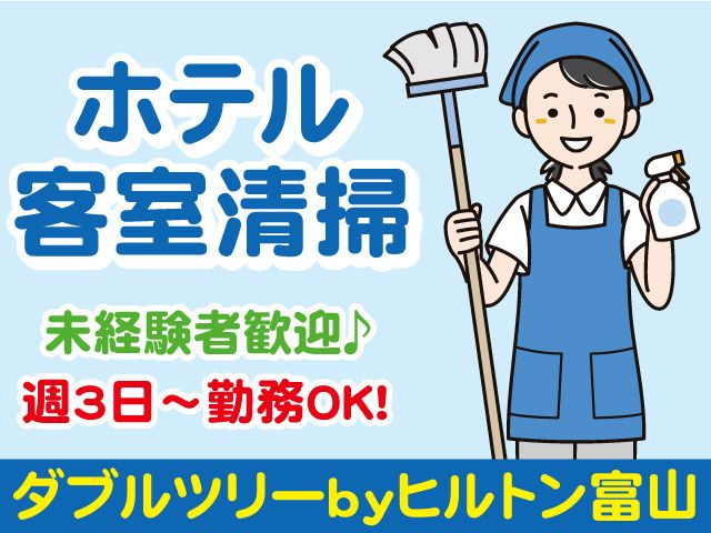 仕事内容 富山駅から徒歩3分のホテル 「ダブルツリーbyヒルトン富山」での 客室清掃員を募集中です。 ///////////////////////////////////////////////// ◎駅チカ!富山駅から徒歩3分! ◎週3日~勤務OK! ◎経験不問!未経験者大歓迎! ◎ミドル・シニア世代まで幅広く活躍中! ◎能力・頑張りに応じて昇給あり! ///////////////////////////////////////////////// 【勤務地】 ダブルツリーbyヒルトン富山 (富山県富山市新富町1丁目1番10号) ※富山駅から徒歩3分 【主な業務内容】 ━━━V━━━━━━━━━━━━ ホテル客室の清掃をお任せします。 ・床掃除、拭き掃除 ・水回りの掃除 ・アメニティの補充 ・ベッドメイクなど ※難しい業務はありません。 【未経験の方大歓迎!】 ━━━V━━━━━━━━━━━━ 清掃業での経験がない方もご安心ください。 未経験の方にはイチから丁寧にご説明いたします。 困った時は先輩スタッフがフォローに入りますので 安心してご応募ください。 【勤務は週3日~OK!】 ━━━V━━━━━━━━━━━━ 週3日~勤務OKです! あなたの働きやすいシフトをご相談ください。 無理なく勤務いただけるよう考慮します! 【Wワークや掛持ち・副業OK】 ━━━V━━━━━━━━━━━━ 別の仕事と両立しながら働きたい方も ご相談ください。 Wワーカーの方、副業として働く方も活躍中です。 【若手から中高年の方まで活躍中!】 ━━━V━━━━━━━━━━━━ 40代~50代で未経験から始めた方も 多数活躍されています。 子育て中の主婦(夫)さんなど 家事や育児の合間に勤務される方もいらっしゃいます! 清掃業が初めての方、 よく分からないという方、 未経験の方もブランクをお持ちの方も 中高年・シニア世代の方もOKです。 ぜひご応募お待ちしております。 まずはお気軽にご相談ください。