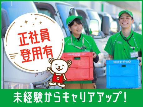 仕事内容 仕事内容について CMでおなじみ「宅配トドック」のサービス員です。食料品や日用品をお届けし、注文用紙の回収や季節商品のご案内もお願いします。 ~具体的には~ ●組合員様宅への商品(食料品・日用品)のお届け ●注文用紙の回収 ●季節・キャンペーン商品のご紹介 ●1日70件前後の固定ルート配送 ~入社後のフォロー体制~ まずは座学研修からスタート。その後、7週間の同乗研修で先輩がイチから丁寧に教えます 。最終テストに合格するまでしっかりサポートするので、未経験でも安心してくださいね !「本当に私にできるかな…」そんな不安がある方は、同乗体験も可能です!実際の仕事を見て、不安を解消してから応募を決められます 。荷物の積込み見学もOKです! 安心・安定の理由は「休日」と「収入」 月給23万円 に加え、残業代は全額支給!お休みは土日固定+平日1日の完全週休3日制!試用期間3ヶ月も給与・待遇は同じです♪ 「私にもできるかな…」その不安、解消します! 普通免許(AT限定)があればOK!運転するのはバックモニター搭載の小型AT車です。元コンビニ勤務や福祉業界など、未経験スタートの先輩が多数在籍しています! 負担が少ないから、長く続けられる! 配送ルートは決まった「固定ルート」!食料品や日用品なので景気に左右されにくく、業務量も安定しています。平均残業も月15h程度と少なめですよ♪ 契約社員でも、将来の安心を。 頑張り次第で正職員を目指せる「正職員登用制度」があります。社会保険完備はもちろん、報奨金制度や共済制度、育児・介護休暇など福利厚生も充実です!