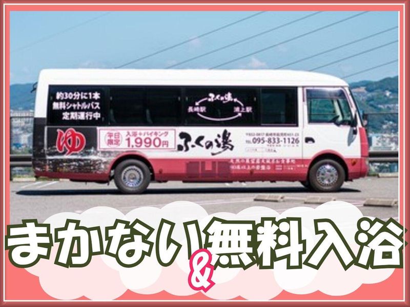 仕事内容 \\\ /// /// 元トラック、バスドライバー活躍中 次のステージは”ふくの湯”で! // //// \ \\ ┏ ━━┅━━━━━━━━┅━━ ┓ ⏩時給1100円!土日祝時給UP ⏩シフト自由に相談OK! ⏩要中型免許 ⏩絶品まかないあり! ⏩お風呂&サウナ入り放題! ┗ ━━┅━━━━━━━━┅━━ ┛ ✨この求人のポイントを紹介します✨ // ★ポイント① お風呂&サウナいつでも無料で入れる! ━━━━━━━━━━━━━━━━━━ いつでも無料でお風呂に入れちゃいます♪ 仕事終わりはもちろん、 お休みの日にリフレッシュしに入浴も可能 働きながら癒される… そんな魅力的なお仕事なのです( ˙-˙ )ᕗ // ★ポイント② 美味しいまかないで栄養チャージ! ━━━━━━━━━━━━━━━━━━ 働きながらオナカも満足できちゃうのが このお仕事の醍醐味! 健康に配慮した職場です! // ★ポイント③ あなたの都合に合わせて自由に働ける! ━━━━━━━━━━━━━━━━━━ Wワークもフルタイム勤務もOK! ご希望の働き方ができますよ♪ ✅Wワークで週2~3日だけ ✅土日のみ・平日のみ ✅ガッツリ稼ぎたいからフルタイム など。 ▹◃┄▸◂┄▹◃┄▸◂┄▹◃┄▸◂┄▹◃ ▽▽お電話でのご応募もお気軽に▽▽ ☎095-833-1126/採用担当まで! ▹◃┄▸◂┄▹◃┄▸◂┄▹◃┄▸◂┄▹◃ 稲佐山温泉ふくの湯の 循環バスのドライバー募集! ◤仕事内容◢ ふくの湯をご利用されるお客様を 長崎駅方面・住吉方面まで送迎する 「施設の顔」になるお仕事です。 ・送迎バスの運転 ・乗り降りの際の簡単な声かけ ・車両の簡単な点検・清掃 ※荷物の積み下ろしなどの力仕事なし ◤運行エリア◢ ふくの湯 ― 長崎駅方面 ふくの湯 ― 住吉方面 ※ルート固定・長距離運転なし ◤こんな方にオススメ ◢ お客様を乗せて運転した経験がある方や 運転が得意、丁寧に運転できる方大歓迎! 長年の経験を活用して働きませんか?? ┏◆━…─────────…━◆┓ 稲佐山温泉 ふくの湯 長崎県長崎市岩見町451-23 ⏩浦上駅より車で5分 ⏩バス停「皿焼」より徒歩5分 ⏩車通勤OK(駐車場完備) ☎お電話でのご応募もお気軽に☎ 095-833-1126/採用担当まで! ┗◆━…─────────…━◆┛