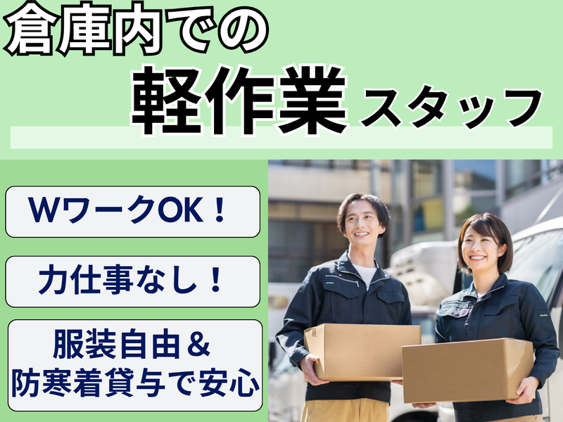 仕事内容 \防寒着貸与有✨冷凍倉庫内も安心/ 【 倉庫内の軽作業スタッフ募集 】 ⭐月収11万円以上も可能! ⭐自分のペースでできるモクモク作業! ⭐車・バイク通勤OKで通勤便利! ⭐平日のみ&週3日~勤務OK♪ ⭐空調完備の休憩室あり◎ ――――――――――――――――――― 《⏩お仕事内容》 倉庫内での軽作業 雑貨や洋服等を扱う倉庫です。 ✅段ボールの仕分け作業 ✅検品作業 など ⏩扱う商品で重いものなし! ✨防寒着貸与あり✨ ※7~9℃の冷凍倉庫内で作業の場合 防寒着を貸与しますので安心して 働けます◎ 無資格・未経験OK!初心者さんも歓迎⭐ シンプルで覚えやすい作業が中心で コツコツモクモク作業が得意な方に ぴったりの環境です◎ 普通倉庫や冷蔵・冷凍倉庫、湾岸倉庫など 倉庫内作業経験がある方、 ピッキングや仕分け、検品・梱包など 入出荷・入出庫作業経験がある方も大歓迎! \従業員数280名以上!/ 定着率が高く人手不足の心配もなし♪ ―――――――――――――――――― お読みいただき、ありがとうございます! 応募やお問い合わせはもちろん、 求人に関する質問も受け付けております♪ 【問い合わせ電話番号】 ✅0120-597-567(平日9時~17時) ✅080-4949-5023(上記時間外) 【応募後のご連絡について】 ✅080-9652-0931 ┗担当者よりご連絡させていただきます。 ※上記番号すべて 営業電話は固くお断りしております。