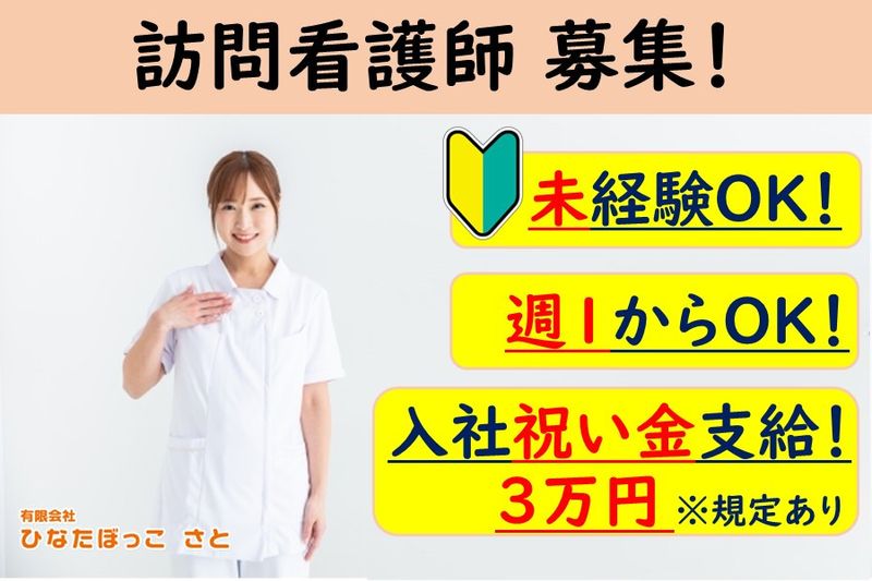 【アピールポイント】 訪問看護のパート看護スタッフ募集! ◎入社祝い金3万円支給(規定あり) ◯ブランクや未経験の方歓迎! 〇週1日からOK! ◯Wワーク・副業もOK!